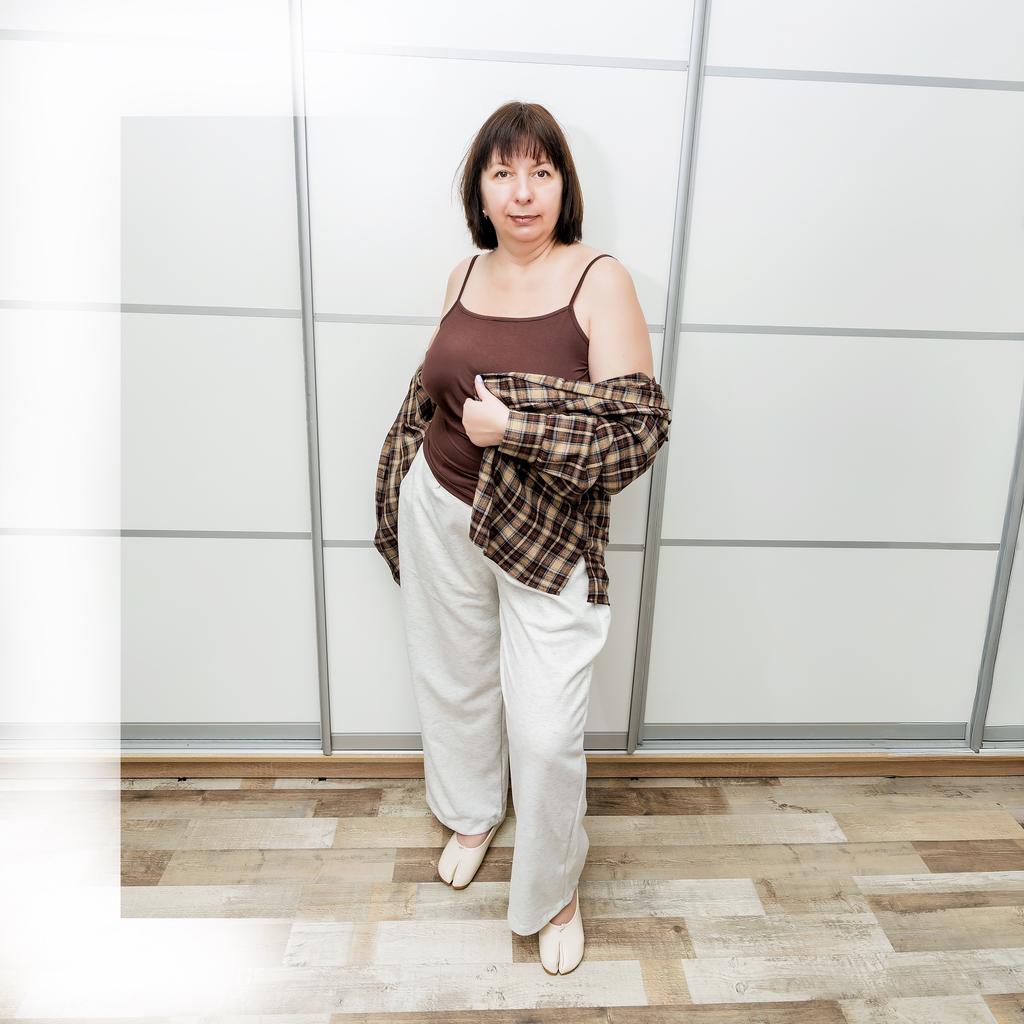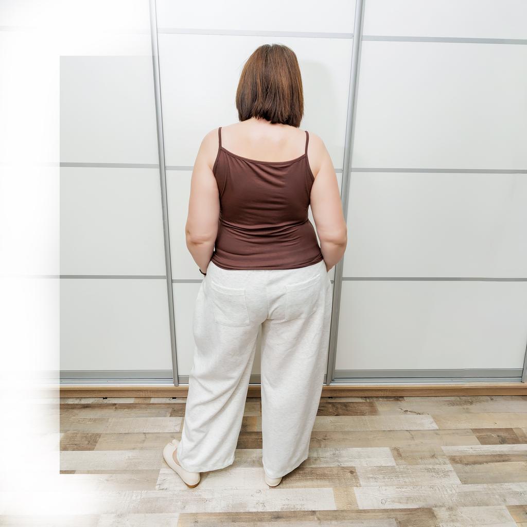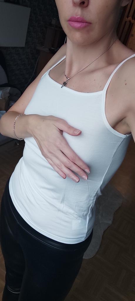 Майка из мода на тонких бретельках. Я просто обожаю этот материал! Он очень приятный к телу и у меня уже много вещей из него и ночнушки и шорты и лонгслив с капюшоном. Но здесь о майке. На мои параметры 120-105-120 размер 2xl сел в обтяжку, но облегает свободно. Конечно ОГ до 140 см, как обещает продавец, не растянется. Но мне вполне комфортно. Буду носить как нижний слой одежды. Хотя даже поверх футболки смотрится стильно и оригинально. В этот раз заказала классический черный цвет, но в пути уже светло зелёный ( под свитер с дырками). В общем смело могу рекомендовать товар к покупке, но на параметры не больше моих.