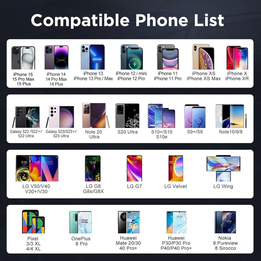 Совместимость с мобильными телефонами:Совместимое зарядное устройство CarQiWireless для iPhone 15/iPhone 15 Pro Max/iPhone 15 Plus/iPhone 14/14 Pro/14 Pro/13 Pro Max/13 Pro/13/13 Mini/iPhone 12 Pro/12/12 Mini/SE (2020) 11/1/1/11 Pro / 11 Pro Max / XS Max / XR / XS / X / 8 / 8 Plus/ Galaxy S22/Galaxy S22+/Galaxy S22 Ultra/Galaxy S23/Galaxy S23+/Galaxy S23 Ultra/Galaxy S20 / S10/S9+/S9/S8+/S7 Edge/S7 Edge/S7 Edge 7/S67 7edge/Note 10/Note 9/Note 8/Note 7/Pixel 3/Pixel 3XL и вся поддержка мобильных телефонов и устройств CarQi Wireless