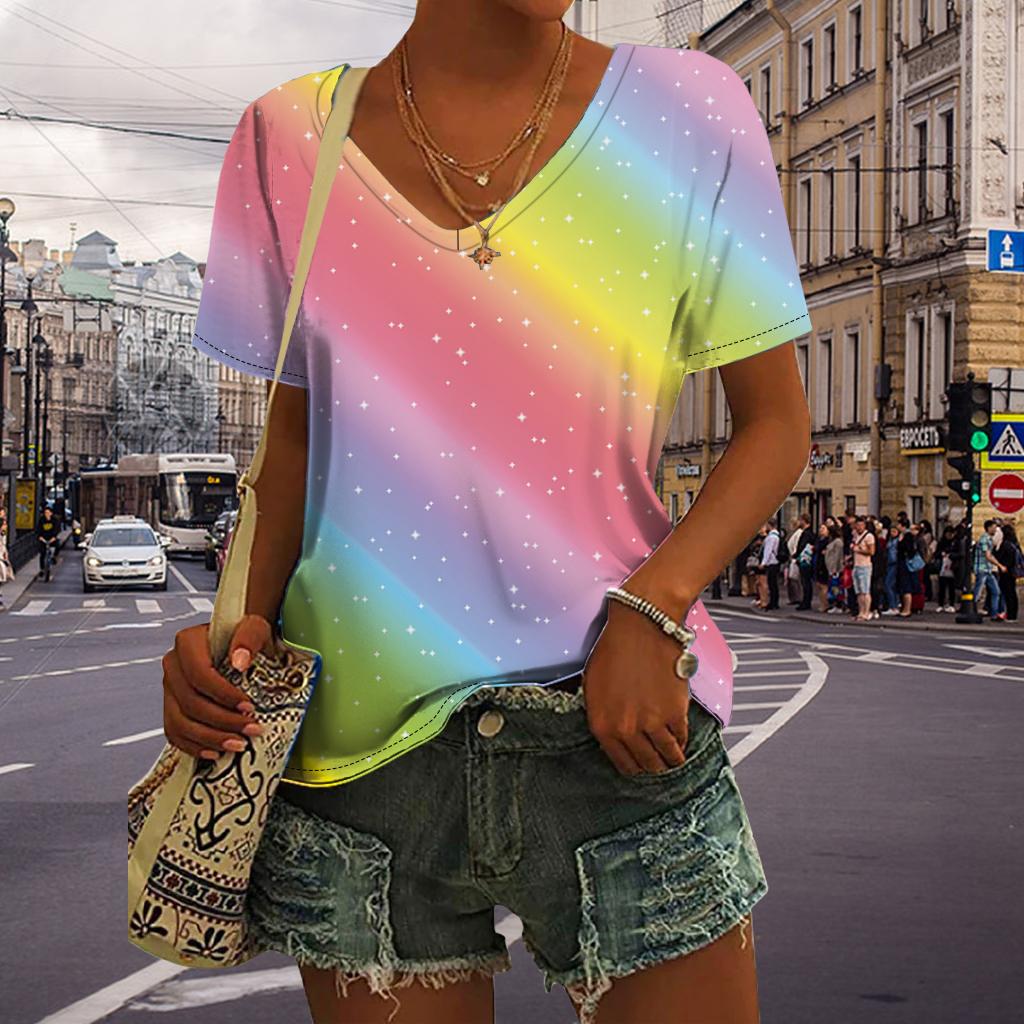 Женские топы с v-образным вырезом и короткими рукавами, розовые звезды с принтом, свободная футболка, повседневная блузка