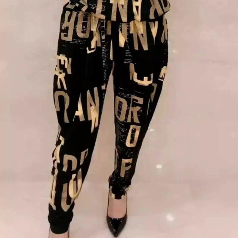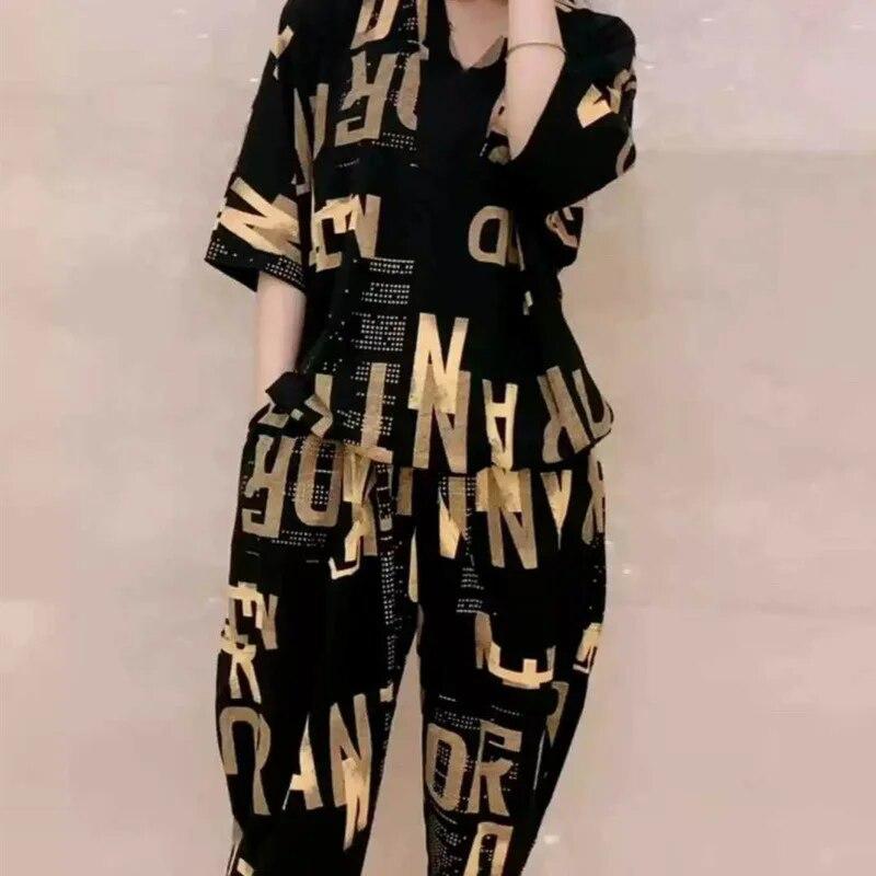Женский костюм, летний повседневный корейский свободный топ с принтом, шаровары, комплект из 2 предметов, модная одежда больших размеров для женщин