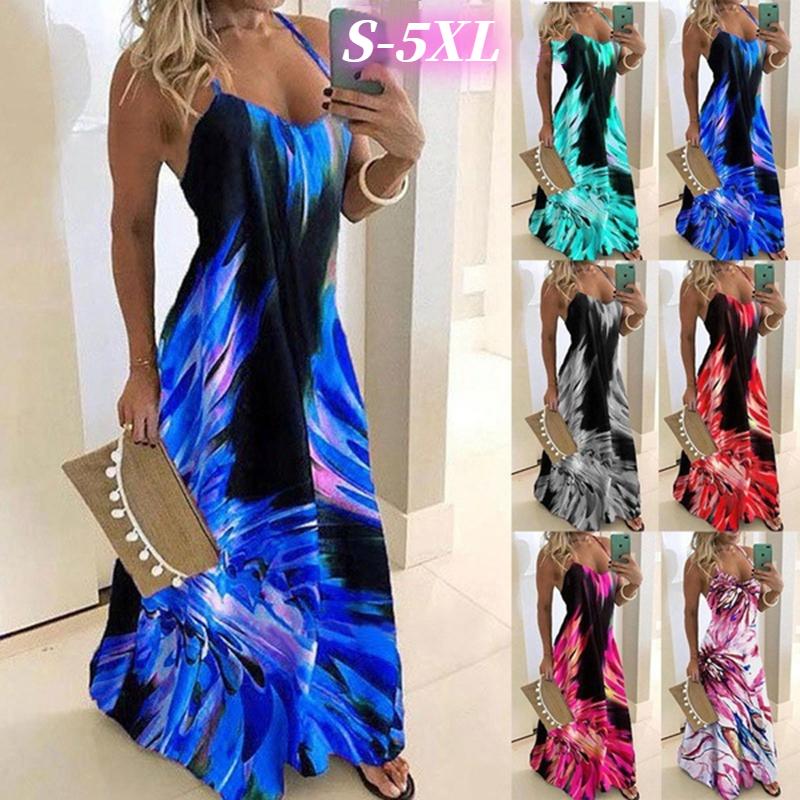 Летнее новое модное женское пляжное платье на бретельках с пламенным принтом, элегантное длинное платье S-5XL — купить товар онлайн с бесплатной доставкой по всему миру!