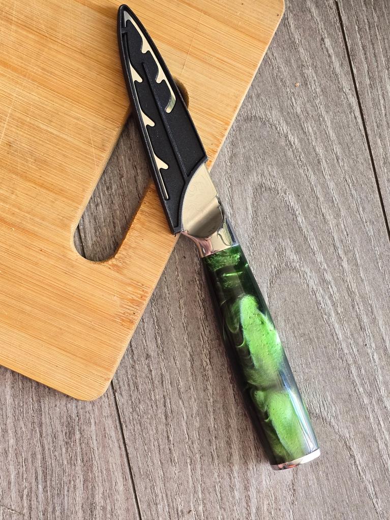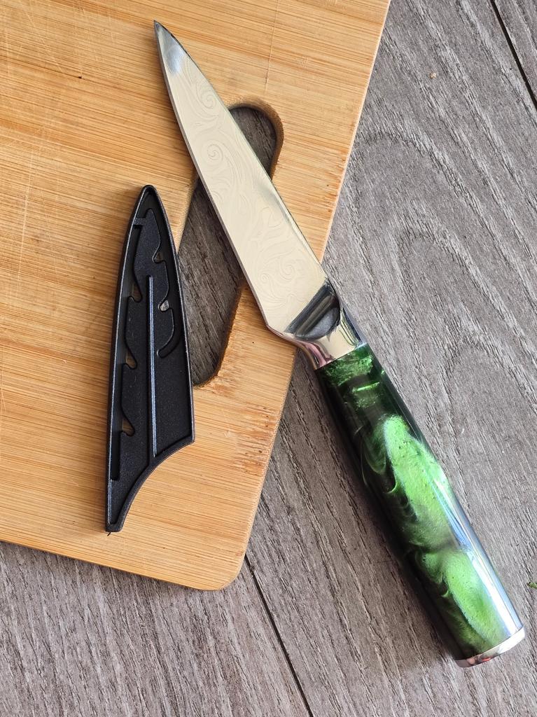 Нож для овощей, длина клинка 9.5 см ❣️ Нож очень удобный, отлично сидит в руке, очень острый и красивый, легко затачивается, долго держит заточку. Такой размер клинка мне подошёл для очистки и нарезки овощей и фруктов. Выглядит гораздо дороже своей стоимости, пришёл в комплекте с чехлом, лезвие протравлено на манер "дамасской стали" #likaste