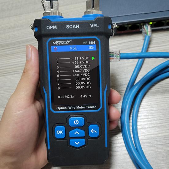 Тестирование POE: Автоматическая идентификация промежуточного пролета/конечного диапазона/мощности по 8 ядрам, автоматическая идентификация стандартных и нестандартных устройств.