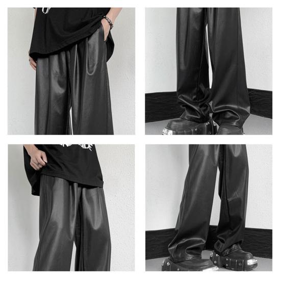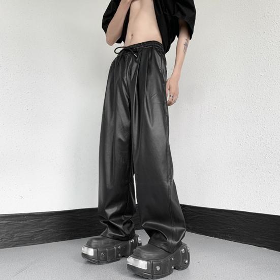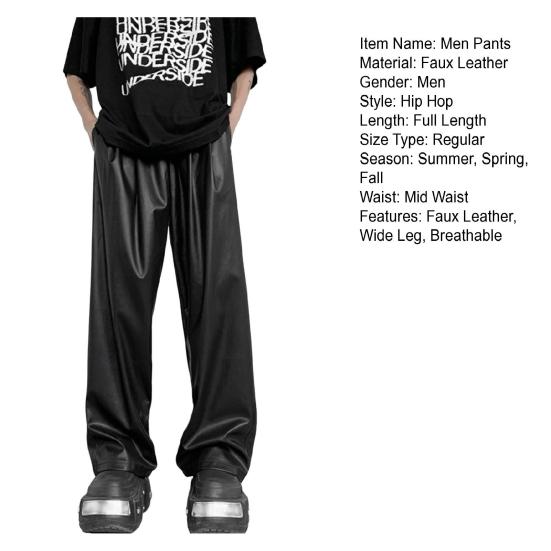 Стиль: Эти мужские брюки из искусственной кожи имеют современный и универсальный дизайн, широкий силуэт, эластичный пояс для удобной посадки и два боковых кармана для дополнительной функциональности.. Сплошной черный цвет придаст любому наряду нотку изысканности.