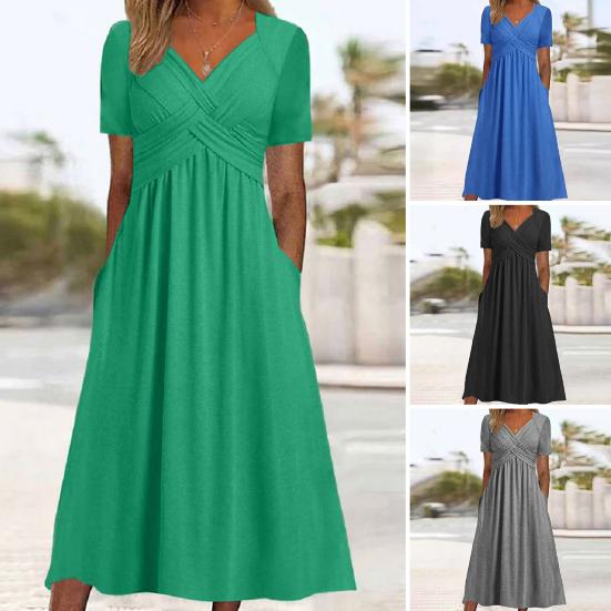 Женское летнее платье с плиссированным ремешком и V-образным вырезом с короткими рукавами, однотонное платье с карманами трапециевидной формы со свободным подолом, дышащее мягкое платье миди для свиданий