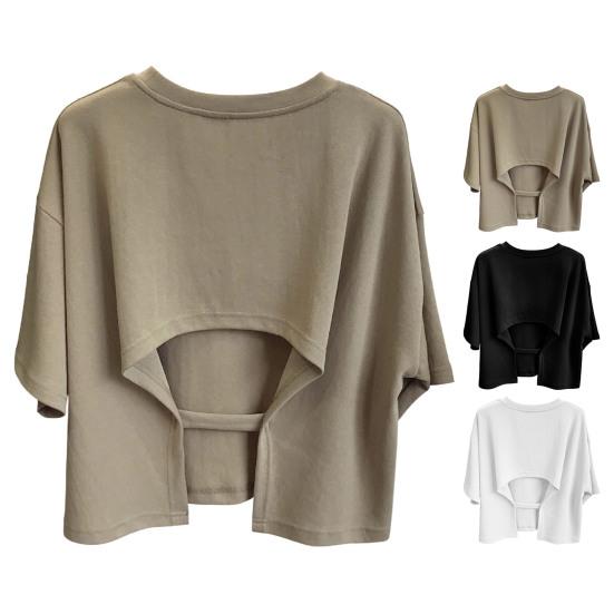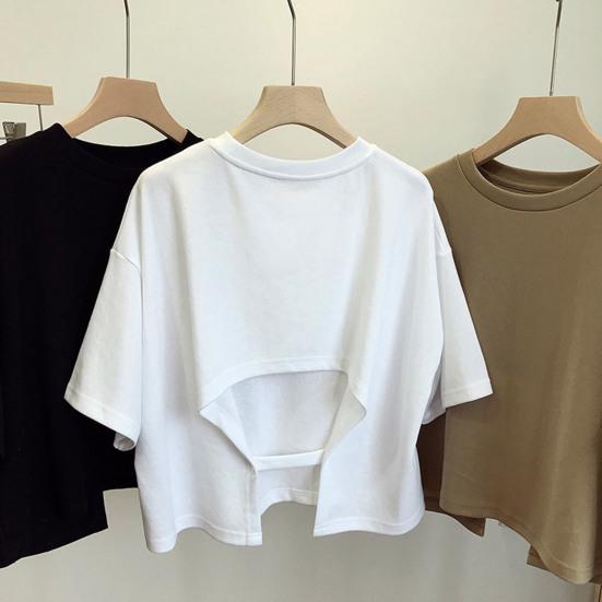 Оцените шикарный дизайн короткой футболки с открытой спиной, круглым вырезом и свободными короткими рукавами, которая идеально подходит для повседневного ношения или наряда для различных случаев.
