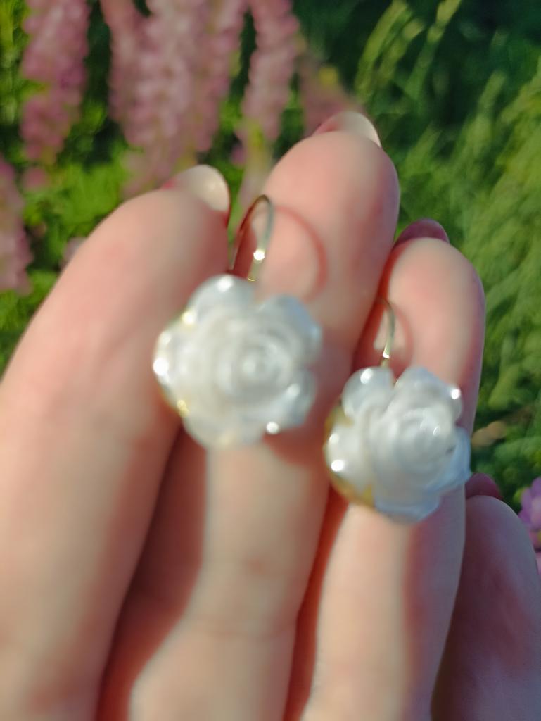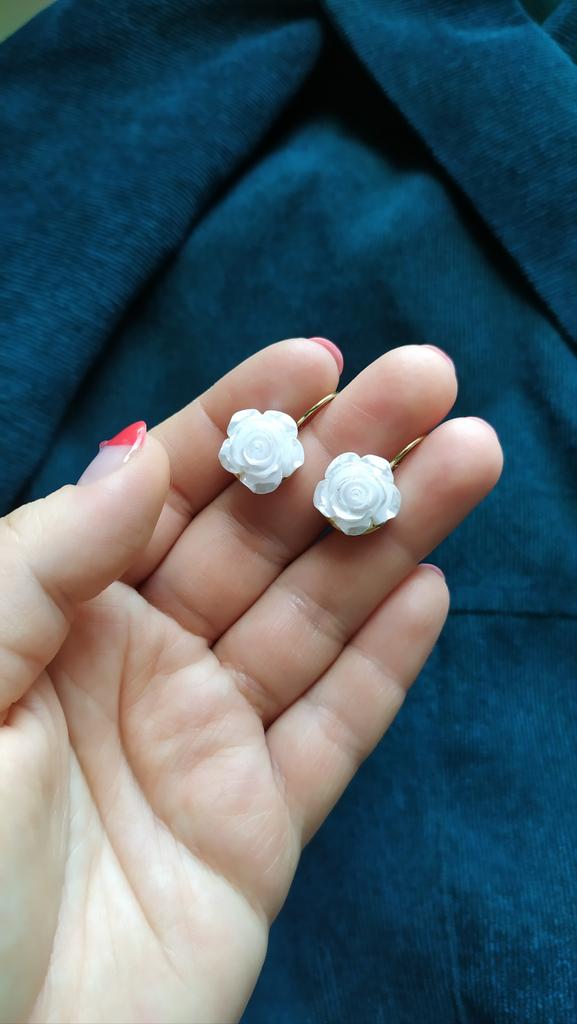 Изящные серьги, жемчужные розы. Эти нежные серьги прекрасно подойдут для повседневной носки, а также эффектно дополнят нарядный вечерний, праздничный образ. Серьги очень легкие, они выполнены из гипоаллергенного бижутерного сплава и практически не ощущаются в ушах. Сплав не вызывает негативной кожной реакции. Если соблюдать все правило носки бижутерии они прослужат очень долго. Нежные, ажурные розы привлекают взгляды и игриво сверкают на свету. Выполнены бутоны из акрила и покрыты перламутром. Крепкий замок, сам не расстёгивается. ⭐ Продавец положил товар в почтовый конверт с пупыркой внутри. ⭐ Трек номер отслеживался до почтового отделения. ⭐ В приложении пришло уведомление о готовности к выдаче заказа. ⭐ Доставка в Петербург заняла 21 день.
