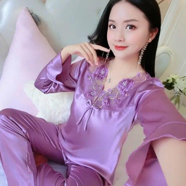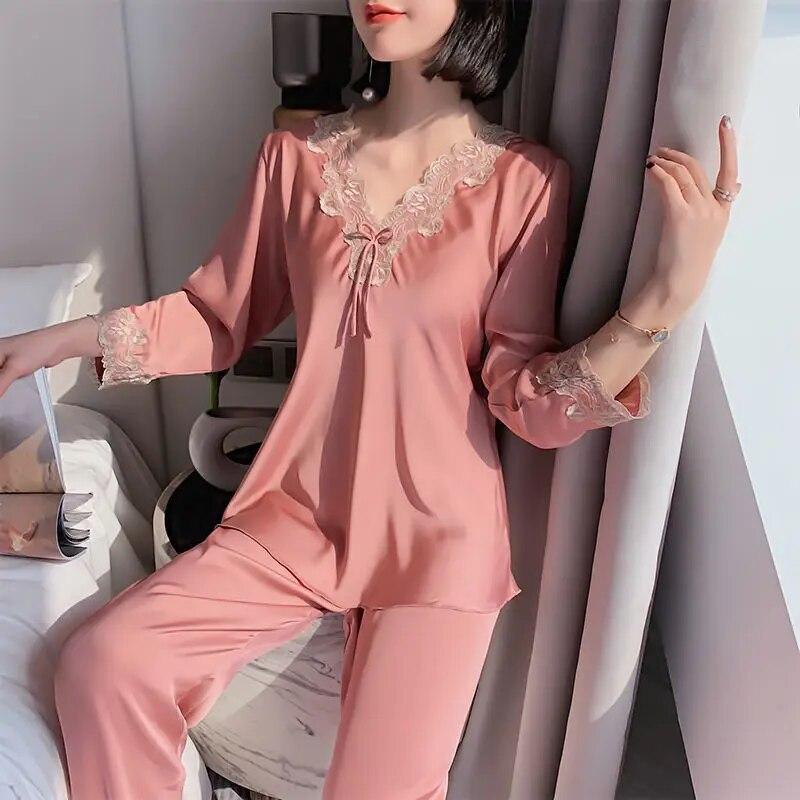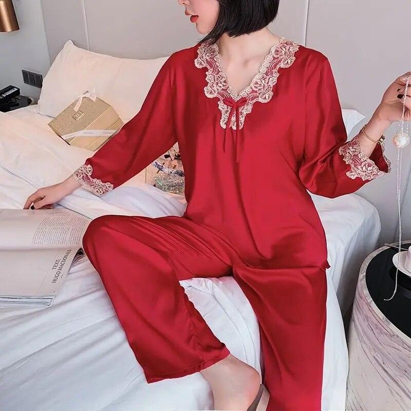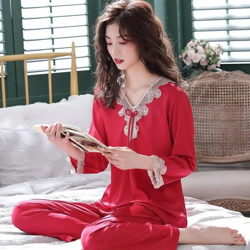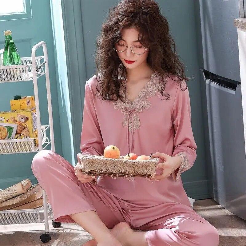 Ледяной шелк, кавайная одежда, женская одежда для сна, большие размеры, брюки с длинными рукавами, пижамные комплекты, кружевные комплекты домашней одежды, весенне-осенние пижамы