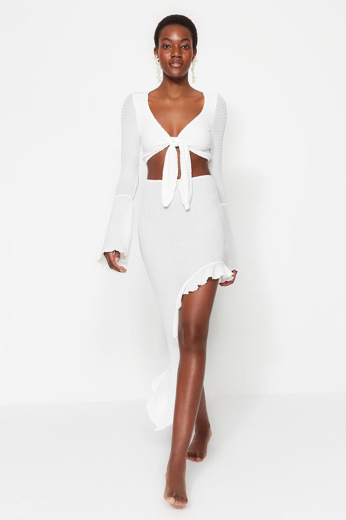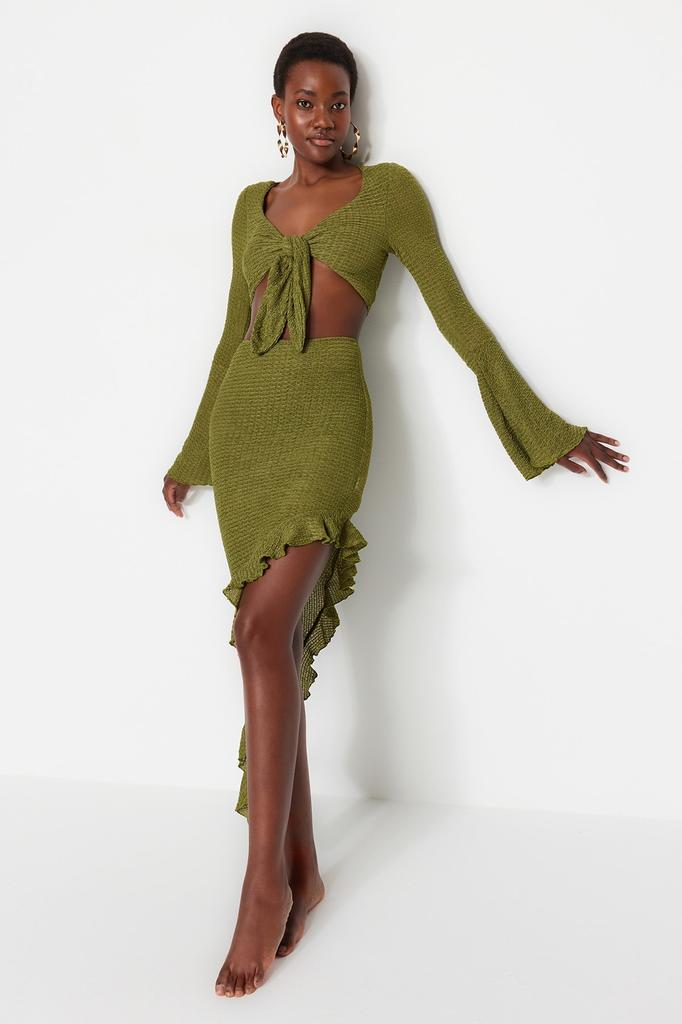 Женский комплект снизу, модный новый сезон, коричневый комплект из тканой блузки с рюшами и юбки