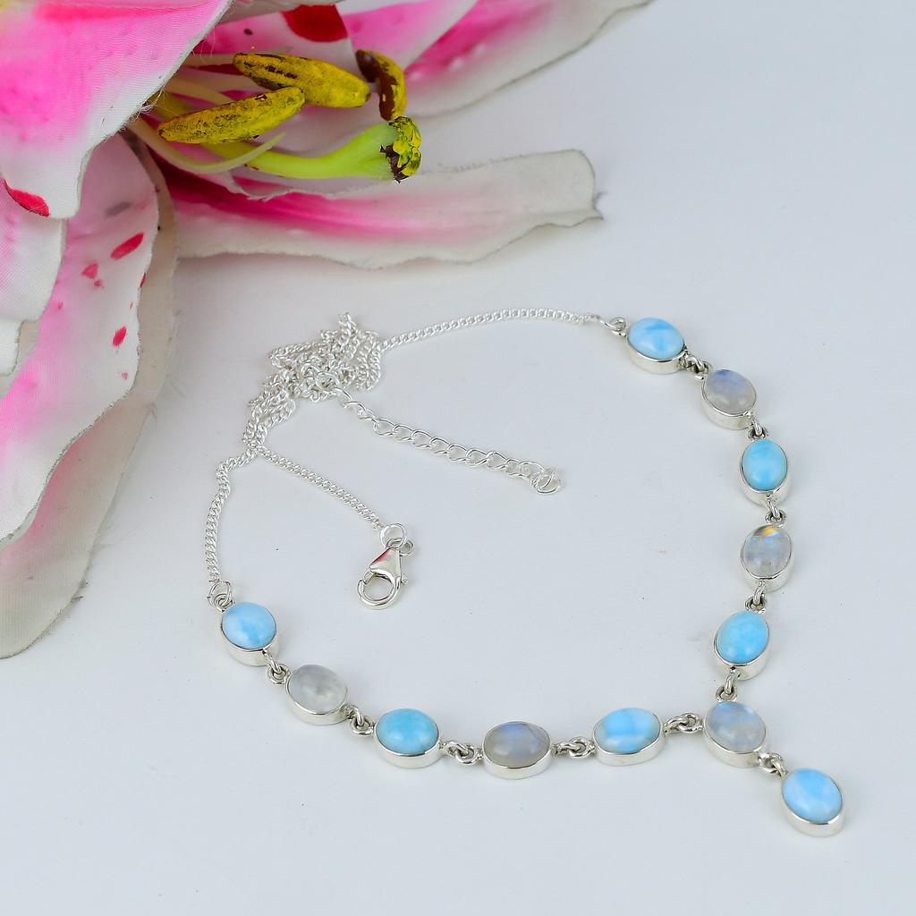 Ожерелье из натурального радужного лунного камня и драгоценного камня Ларимар 925 пробы, 18 дюймов b7W41