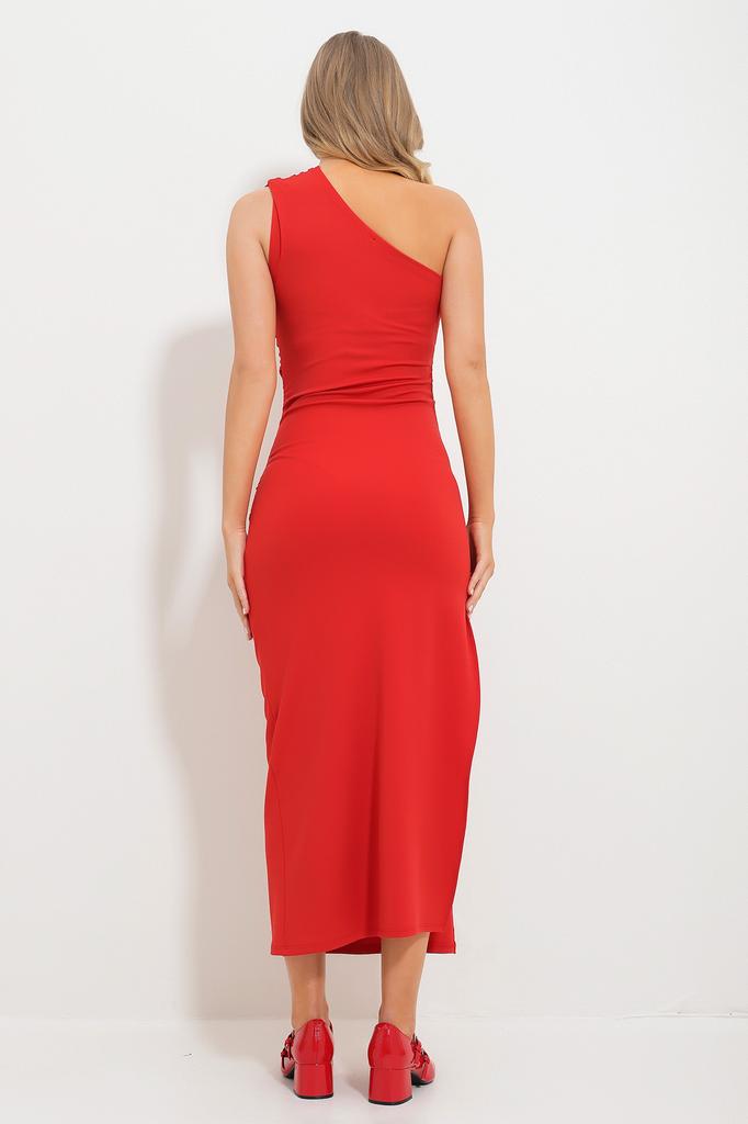 Женское платье, новый сезон, модное красное трикотажное платье из лайкры с драпировкой на одно плечо и глубоким разрезом