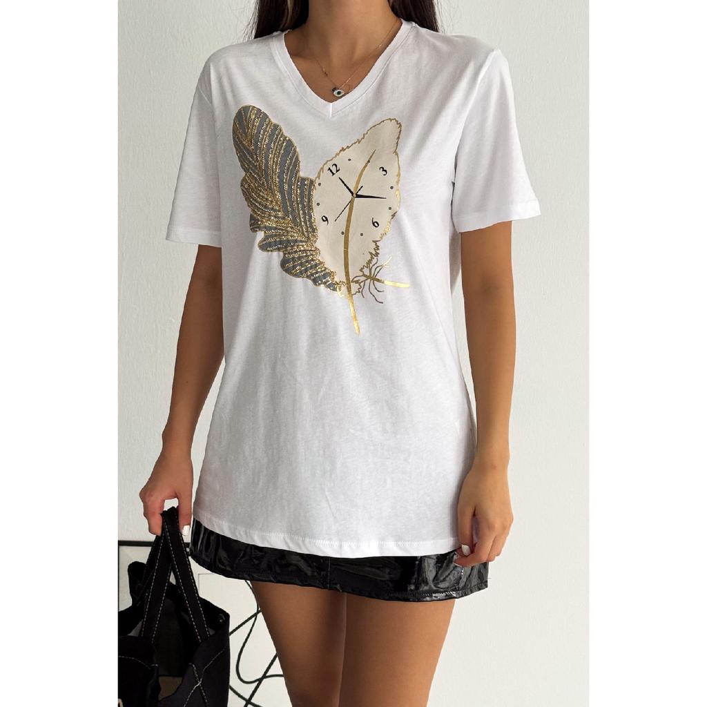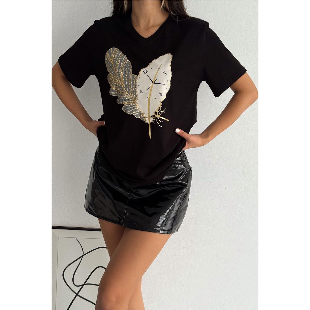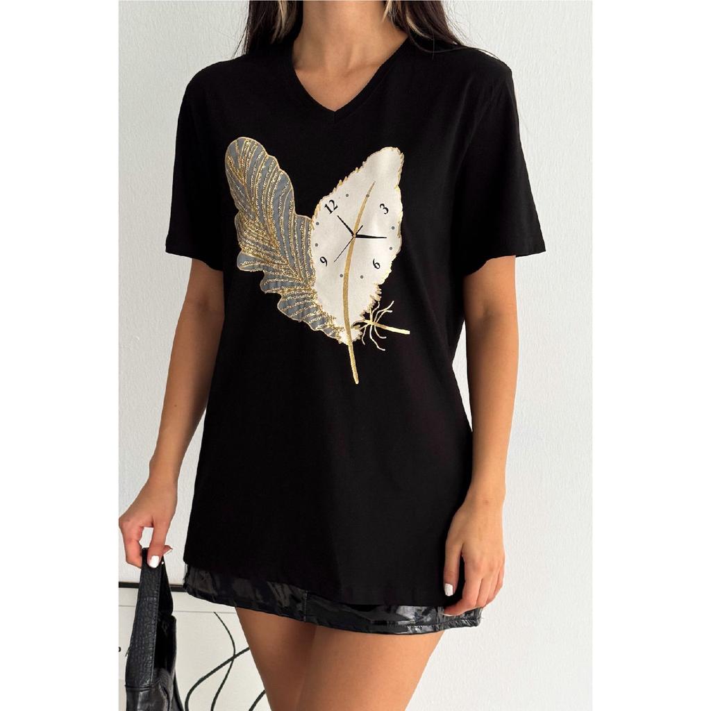 Женская черная футболка с v-образным вырезом больших размеров из 100% хлопка с вышивкой перьями и часами и блестками, футболка больших размеров