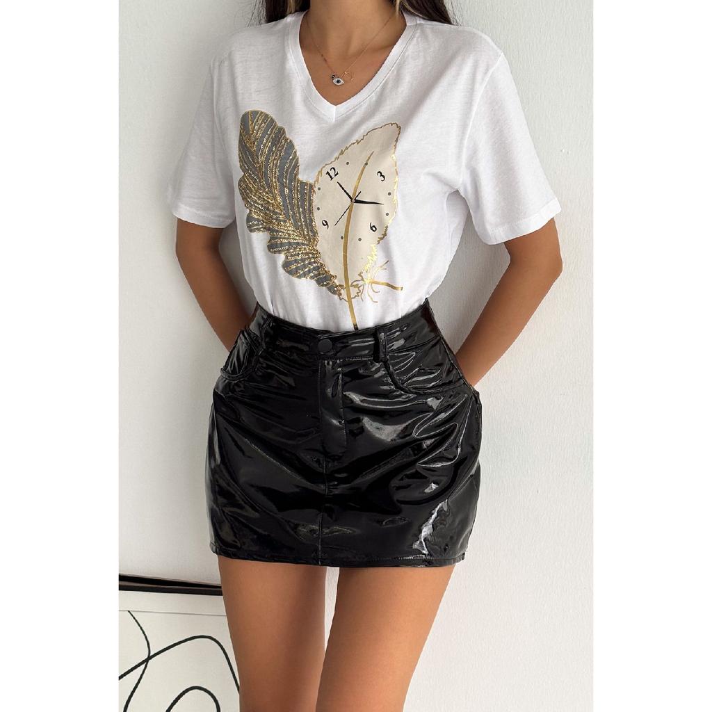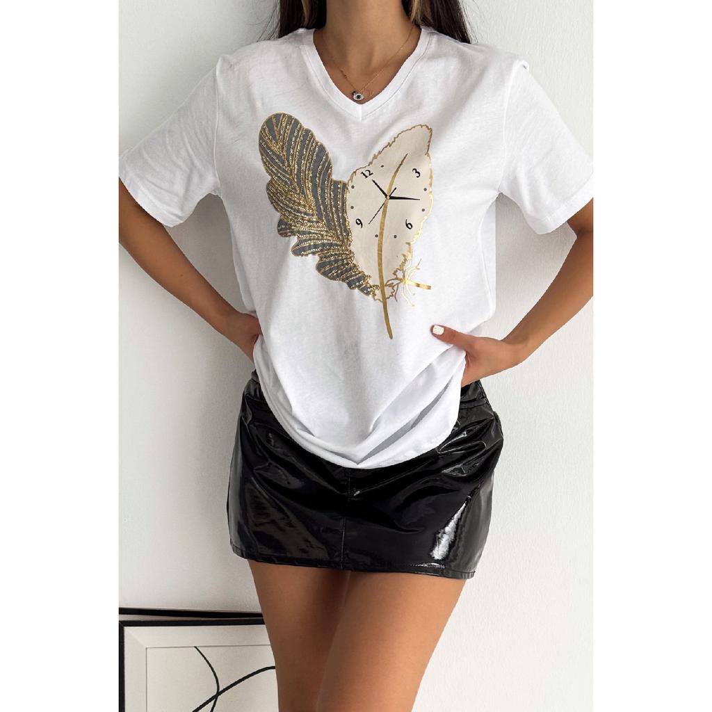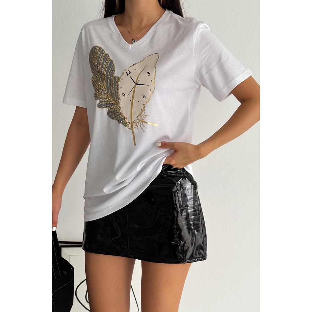 Женская черная футболка с v-образным вырезом больших размеров из 100% хлопка с вышивкой перьями и часами и блестками, футболка больших размеров