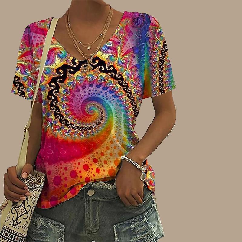 Женская свободная футболка с v-образным вырезом и короткими рукавами, цветной вихревой принт, повседневная рубашка