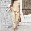 Модный и сексуальный женский весенне-летний льняной костюм в стиле ретро с эластичным поясом на талии, модный однотонный повседневный комплект из двух предметов