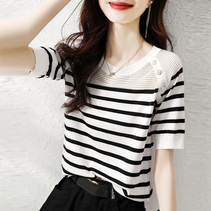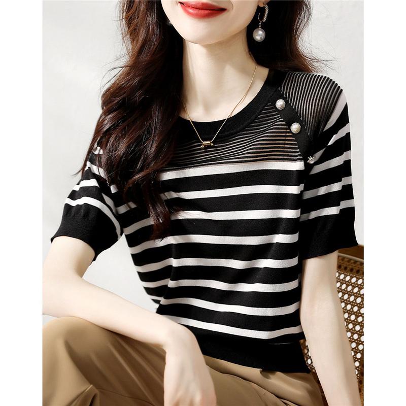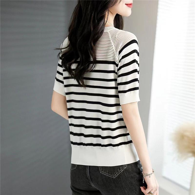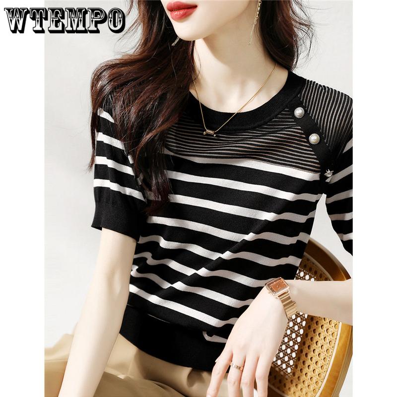 WTEMPO Женская сетчатая лоскутная полосатая элегантная вязаная футболка, модный летний тонкий пуловер с короткими рукавами, вязаные топы