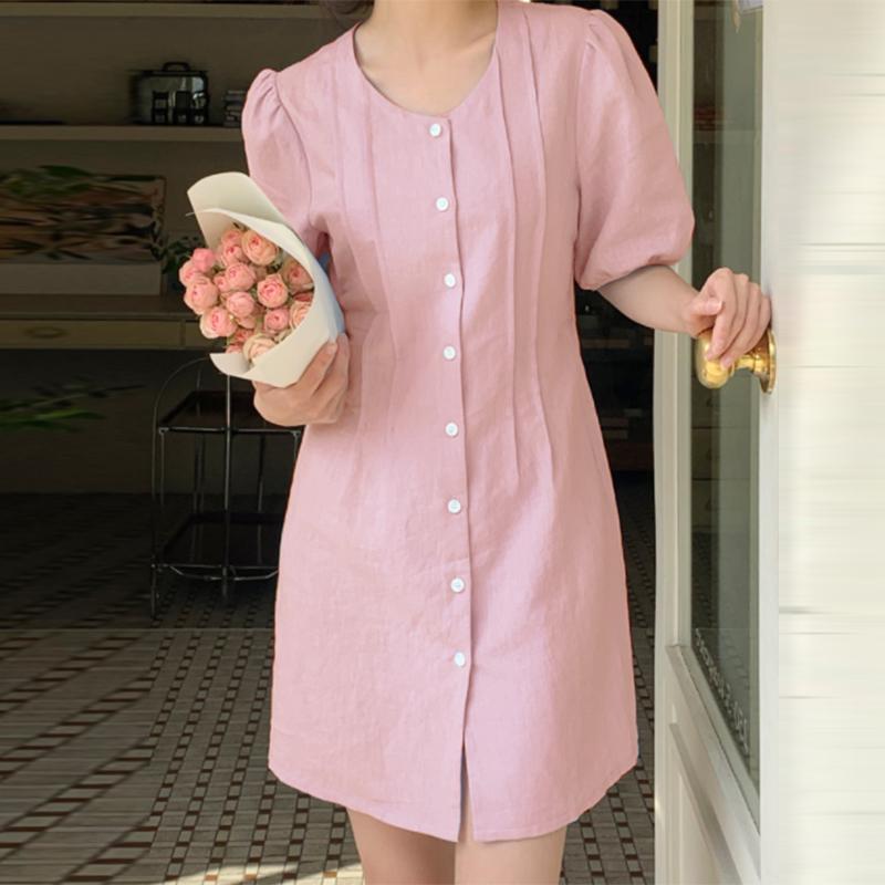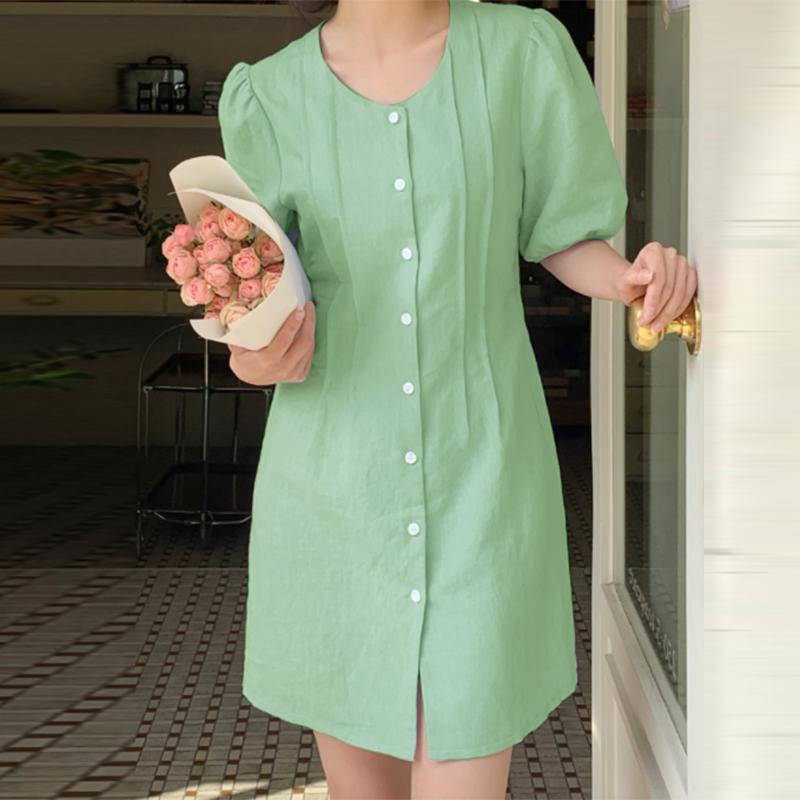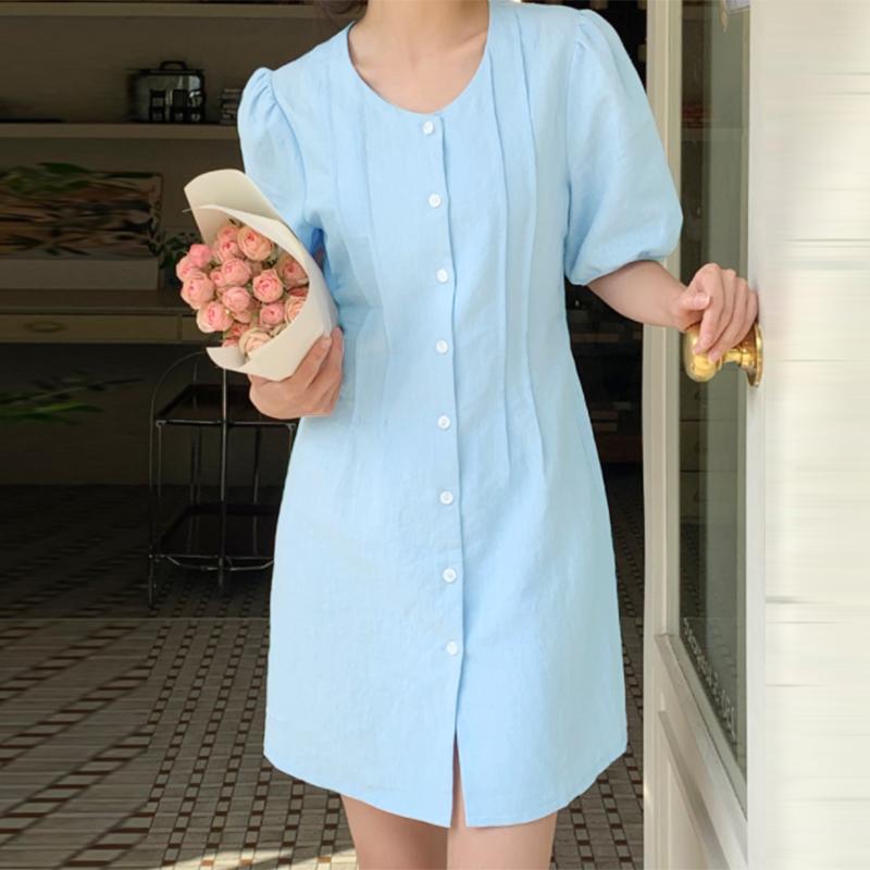 Характеристики:Круглый вырез, короткий рукав, пышные рукава, кружево, накладной клапан спереди, однотонное платье, платье