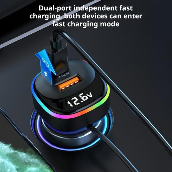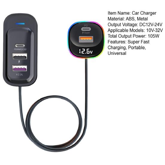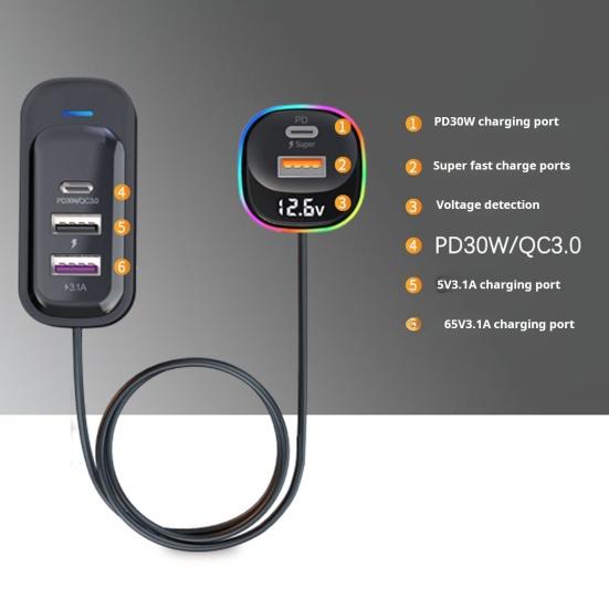 Это многопортовое автомобильное зарядное устройство, оснащенное сверхбыстрым зарядным портом мощностью 30 Вт, поддерживает быструю зарядку для всех типов мобильных телефонов, увеличивая скорость зарядки на 80 процентов для быстрого и удобного включения питания.. Интеллектуальный цифровой дисплей обеспечивает мониторинг напряжения батареи в режиме реального времени.