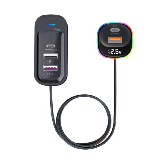 Это многопортовое автомобильное зарядное устройство, специально разработанное для автомобильных зажигалок, имеет элегантный дизайн, который легко сочетается с основными моделями автомобилей, обеспечивая надежное и эффективное решение для зарядки всех ваших электронных устройств.