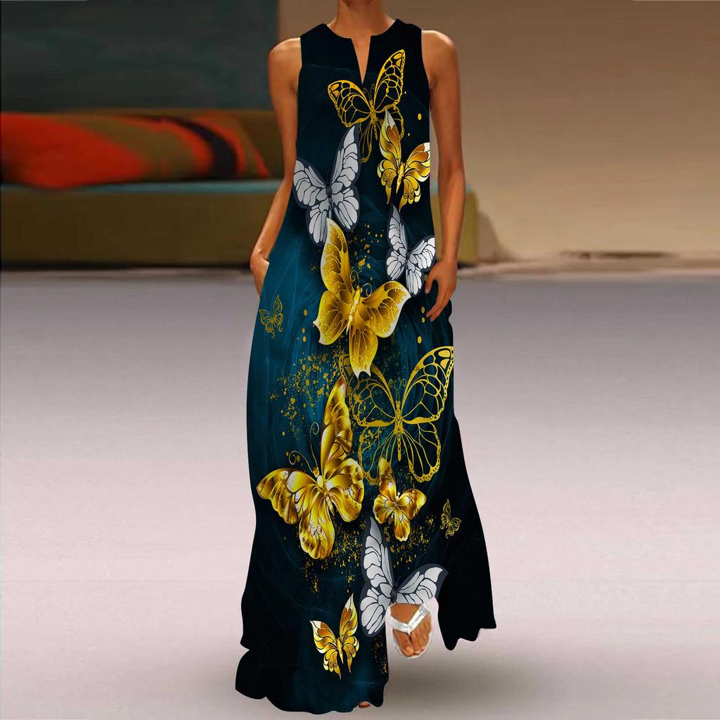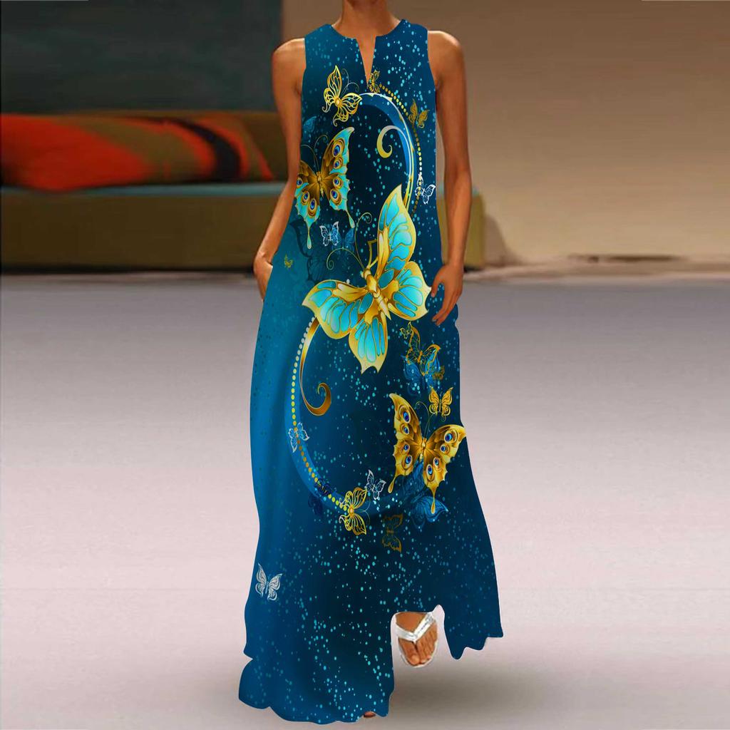 Женское платье трапециевидного силуэта, макси, длинные рукава, синий жемчуг, принт бабочки, осень и зима, v-образный вырез, стиль ретро, элегантный