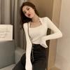 Женские весенне-осенние топы с U-образным вырезом, трикотажная рубашка, пуловеры с длинными рукавами, облегающая блузка, тонкий свитер, укороченный топ, сплошной цвет, вертикальные полосы