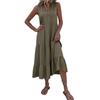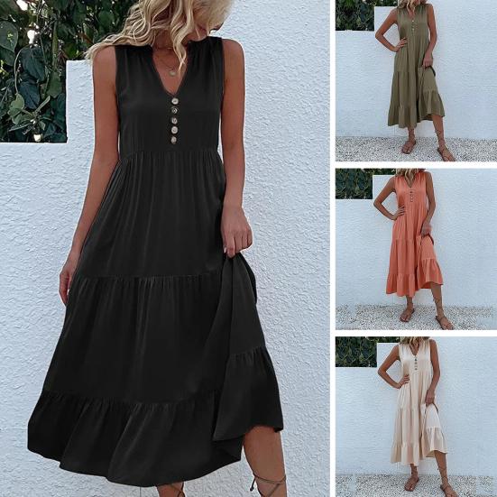 Летнее платье миди с V-образным вырезом, плиссированным лоскутным подолом, трапециевидной формы без рукавов, однотонный декор с пуговицами, свободное до середины икры, пляжное женское длинное платье для отпуска