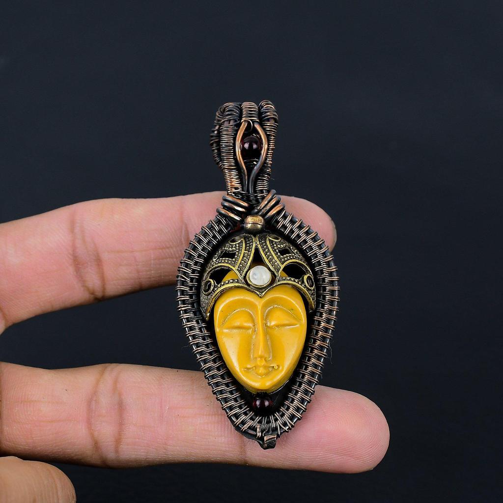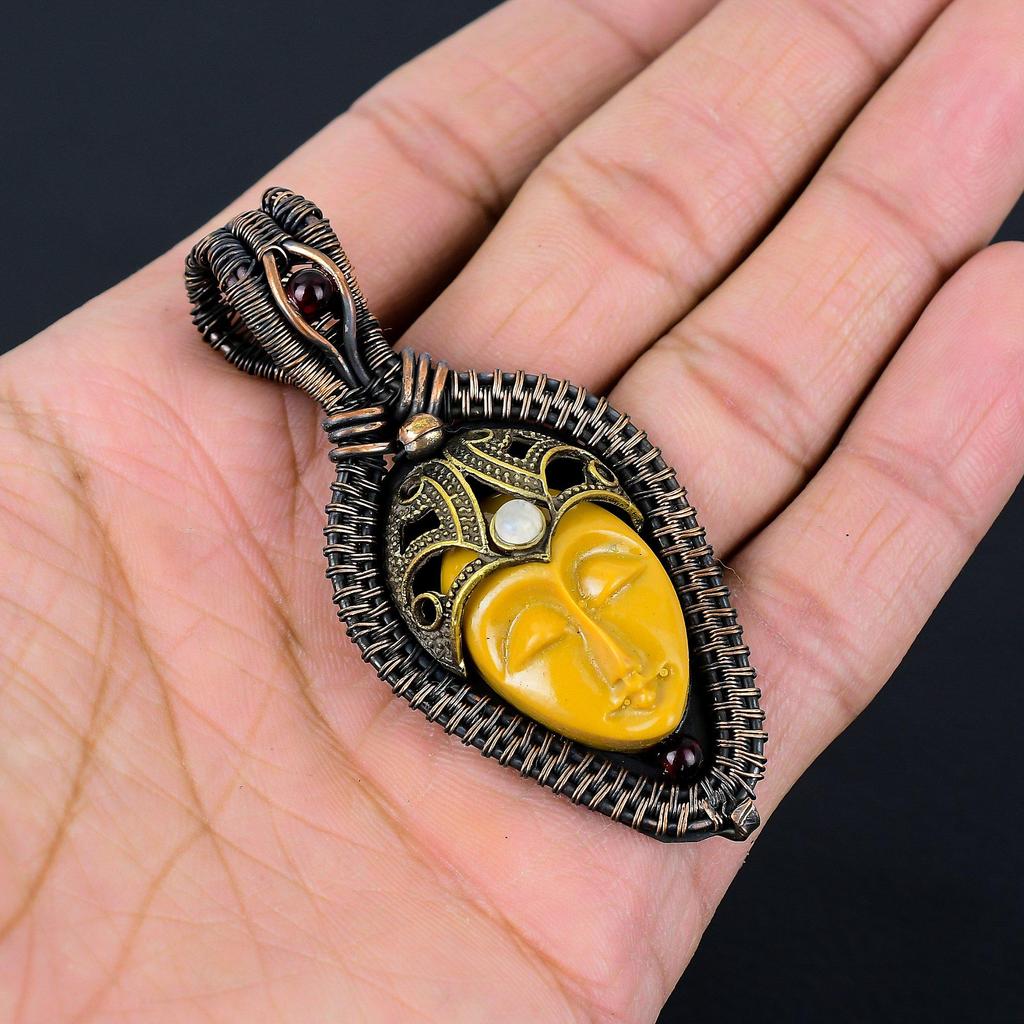 Очаровательная желтая резная кость для лица и лунный камень, драгоценный камень, обертка из чистой медной проволоки, ювелирный кулон ручной работы