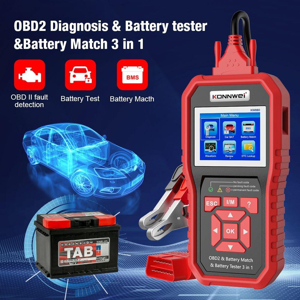 KONNWEI KW880 Тестер автомобильного аккумулятора, диагностический инструмент OBD II и аккумулятор, функция 3 в 1