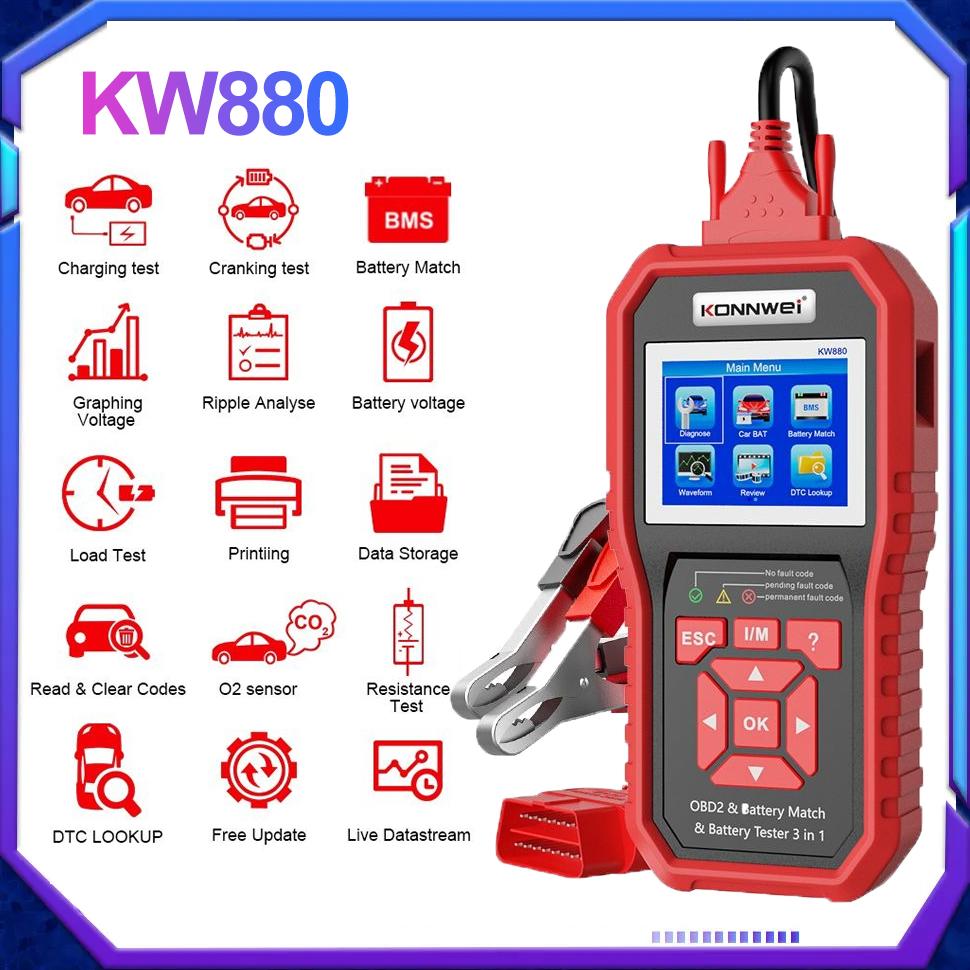 KONNWEI KW880 Тестер автомобильного аккумулятора, диагностический инструмент OBD II и аккумулятор, функция 3 в 1