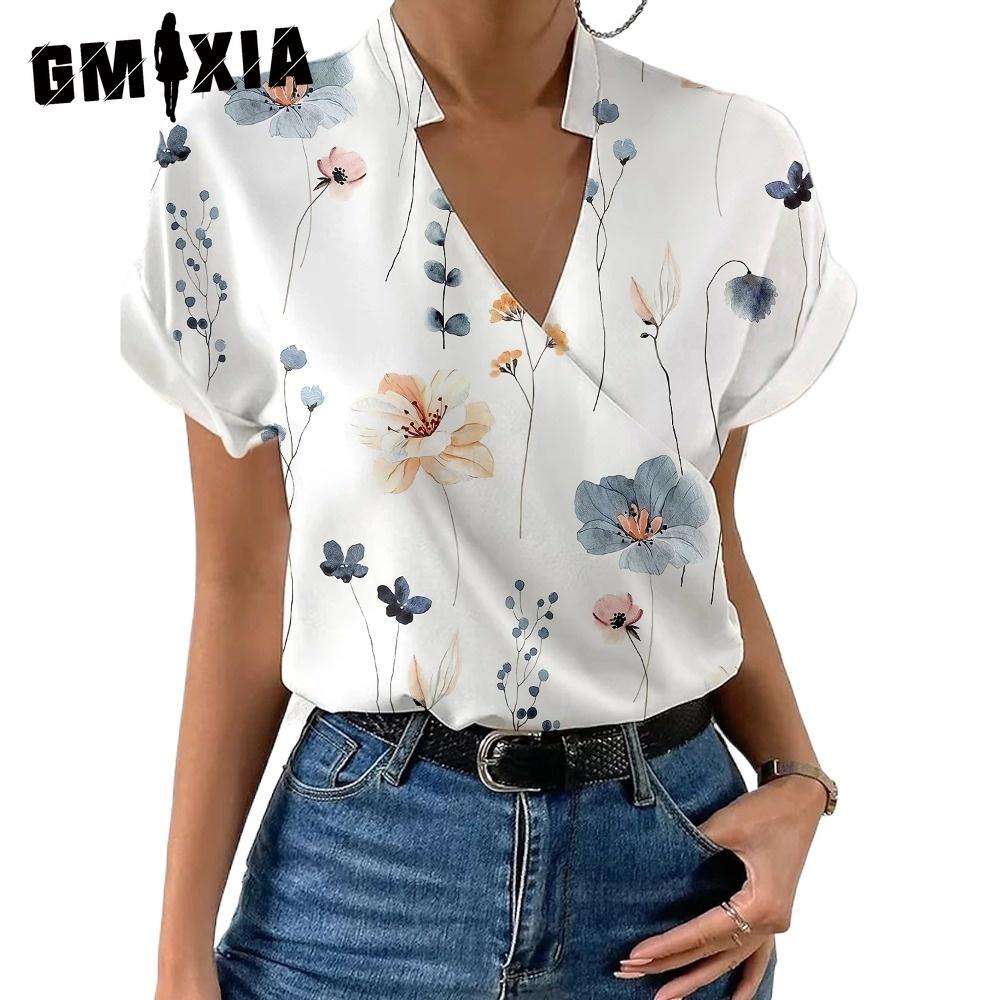 GMXIA Женские модные повседневные летние блузки и рубашки с v-образным вырезом и коротким рукавом с цветочным принтом