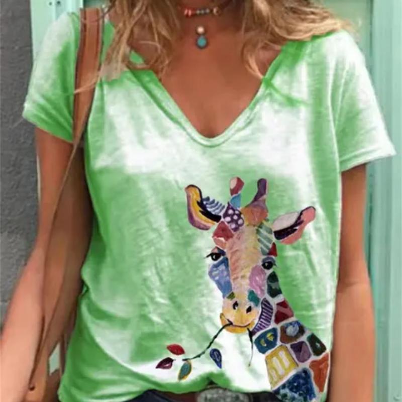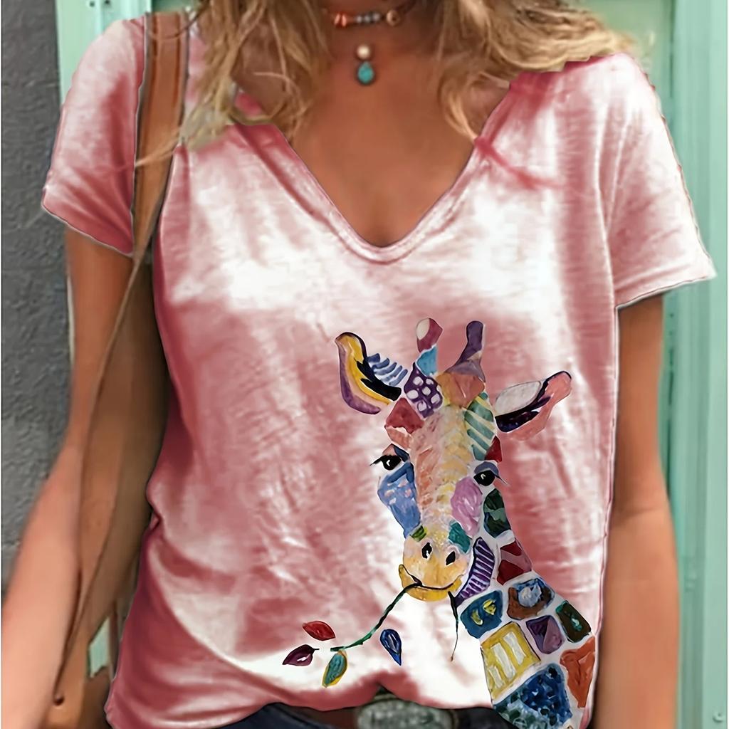 2024 Новый стиль, женская футболка с принтом жирафа, женская футболка с v-образным вырезом, топ для женской одежды, модный дизайн, летняя футболка с коротким рукавом