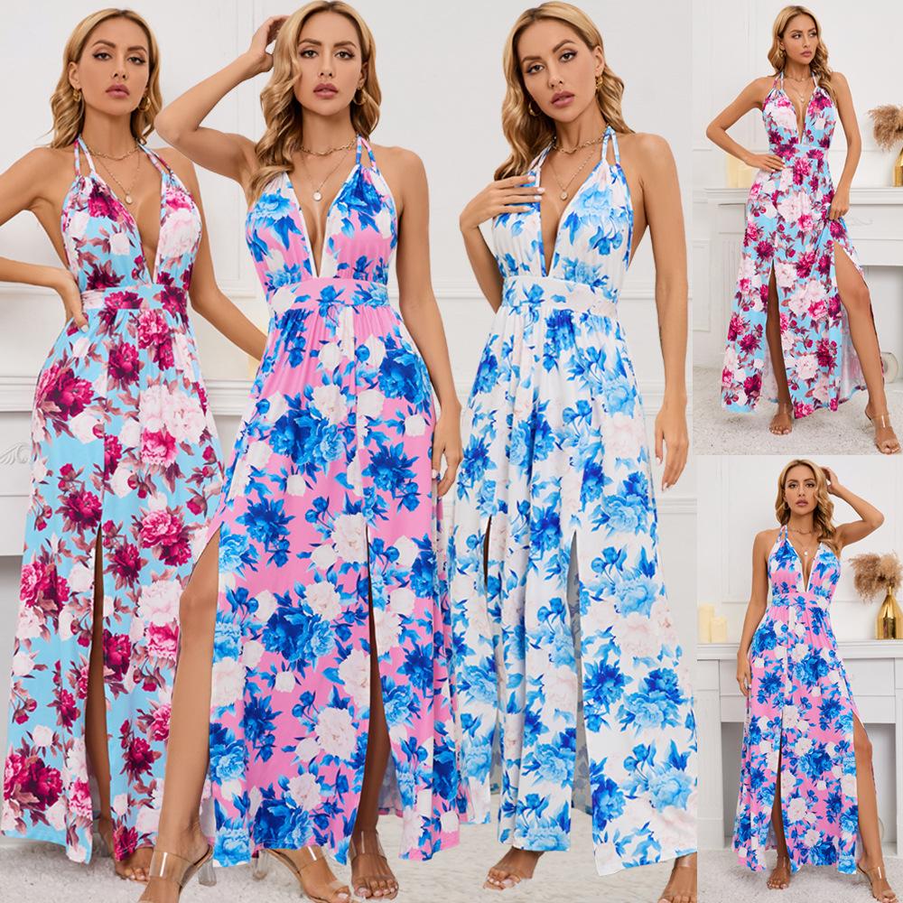 Сексуальное платье с глубоким v-образным вырезом на бретелях, летняя длинная юбка с разрезом по краю и принтом, женская одежда больших размеров — купить товар онлайн с бесплатной доставкой по всему миру!