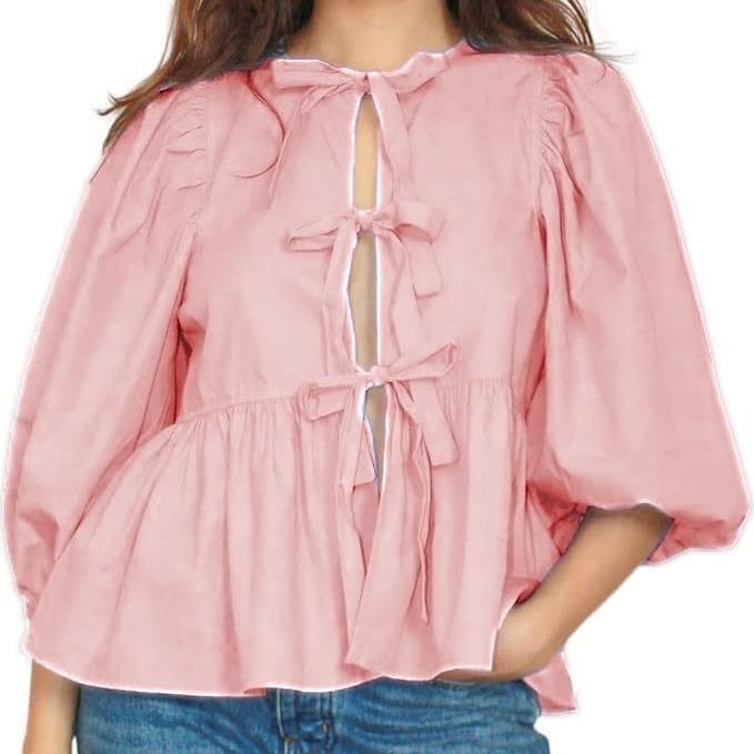 Весенние рубашки с круглым вырезом и контрастным бантом на шнуровке для женщин, свободная блузка с длинными рукавами-фонариками