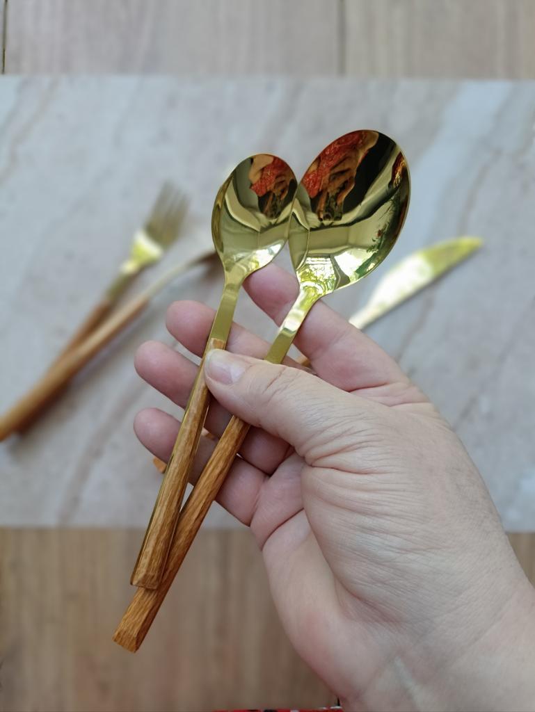 Набор из 5 столовых приборов из нержавеющей стали. Я выбрала в красивом цвете лимонного золота. Наборчик очень хороший! Металлические части отлично отполированы и сверкают! Ручки аккуратные, гладкие и выглядят как деревянные. Я бы,собственно, и подумала, что это дерево, если бы не было в описании оговорки, что это имитация дерева. В наборе есть нож столовый, ложки большая и маленькая, и вилки большая маленькая. Стоит все удовольствие 415 рублей! Ну прелесть!