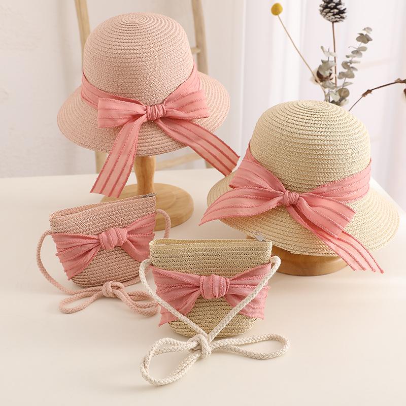 Летняя пляжная шляпа от солнца для девочек, милая соломенная шляпа с бантом и сумка на плечо, комплект из 2 предметов, уличная солнцезащитная шляпа, детские пляжные шляпы