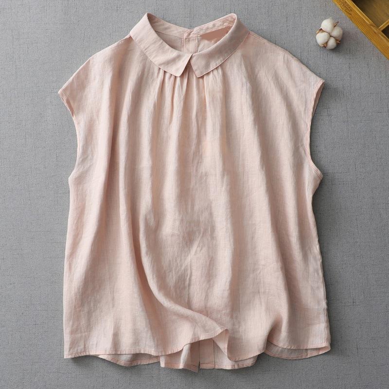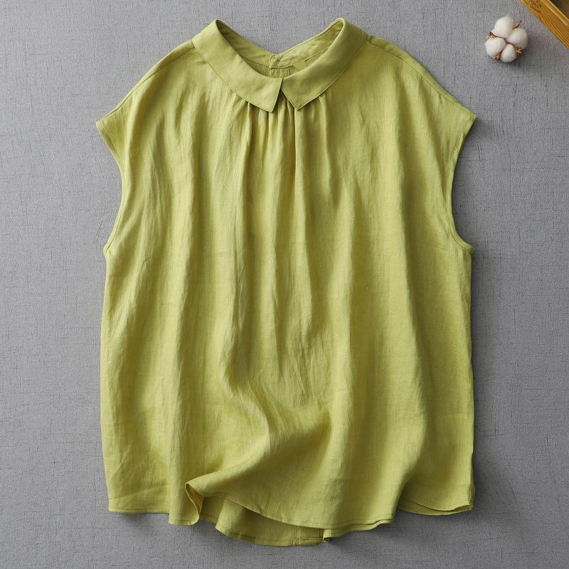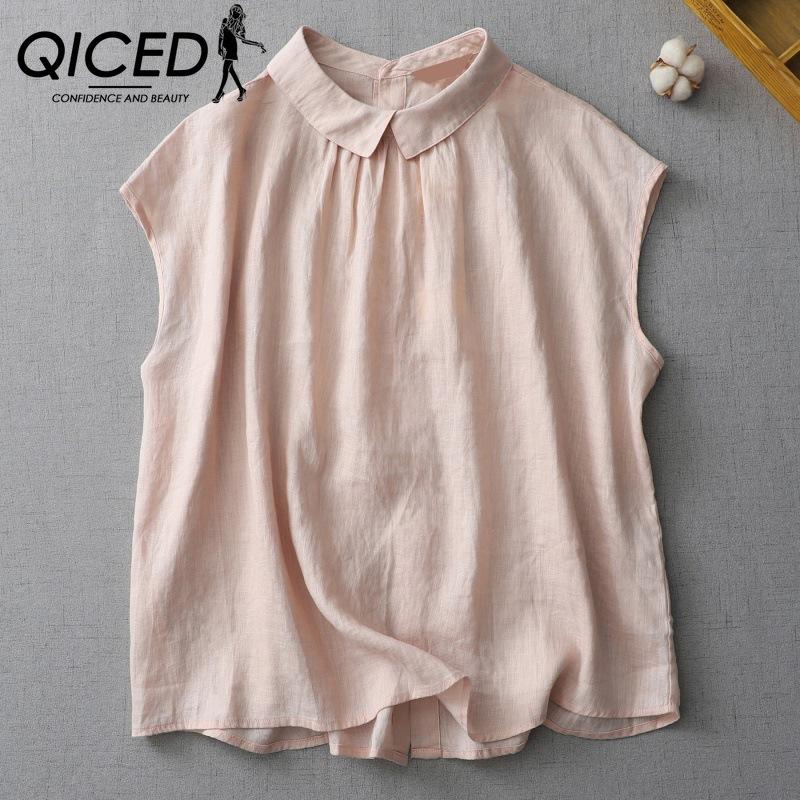QICED Однотонная хлопково-льняная рубашка без рукавов с кукольным воротником, женская летняя одежда для снижения возраста, рубашка для похудения с обеих сторон, повседневная льняная блузка