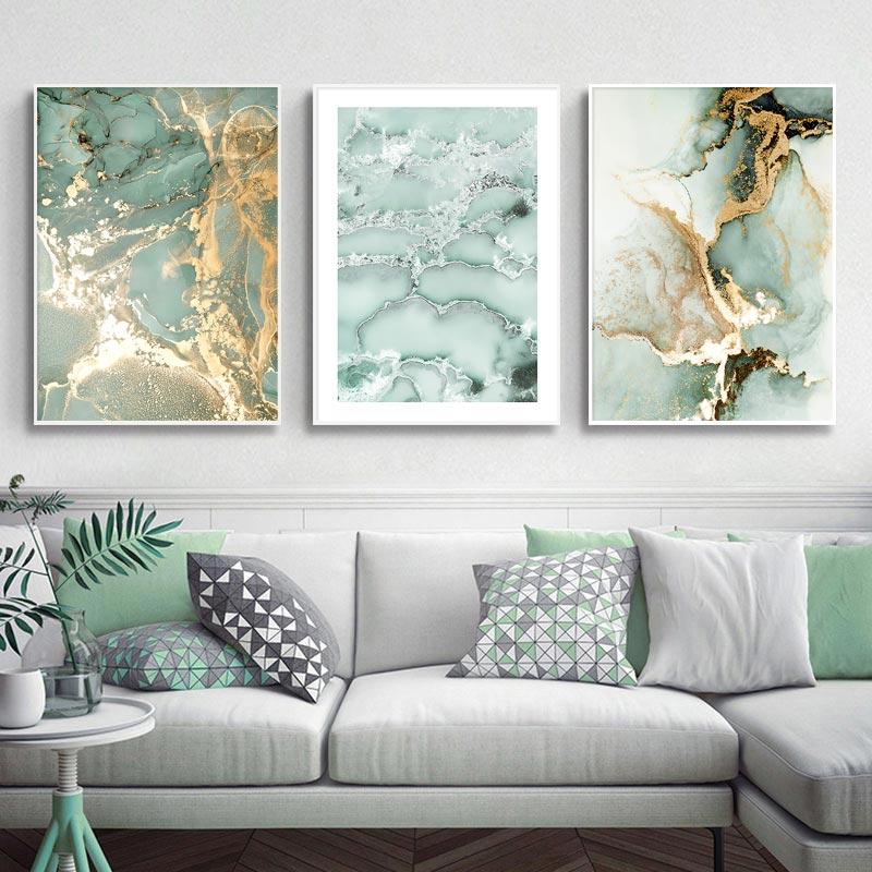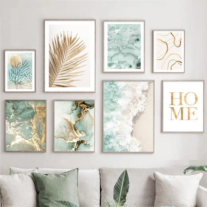 Песочные волны, золотые пальмовые постеры, абстрактная зеленая мраморная линия, коралловая настенная живопись, холст, живопись, настенные панно для декора гостиной