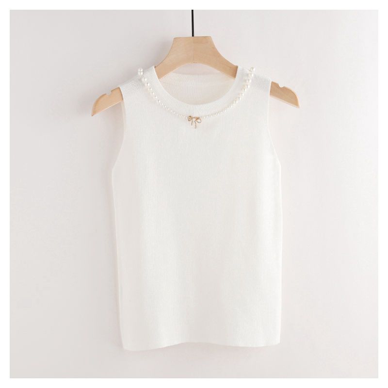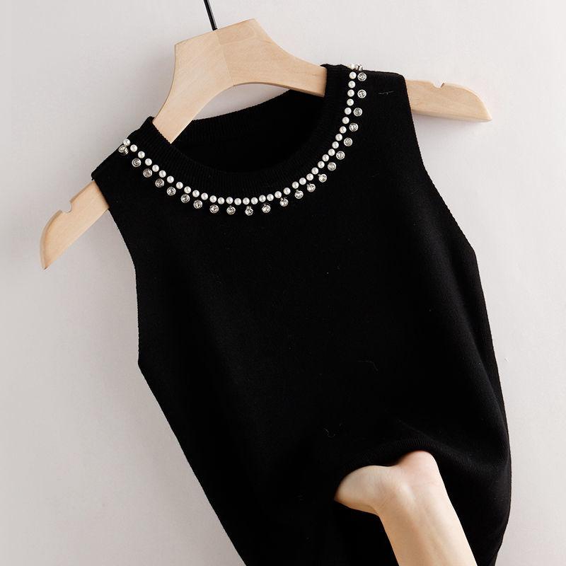 Женская вязаная майка с круглым вырезом и бисером, женская мода, весна-лето, вязаная нижняя рубашка, однотонные тонкие топы без рукавов
