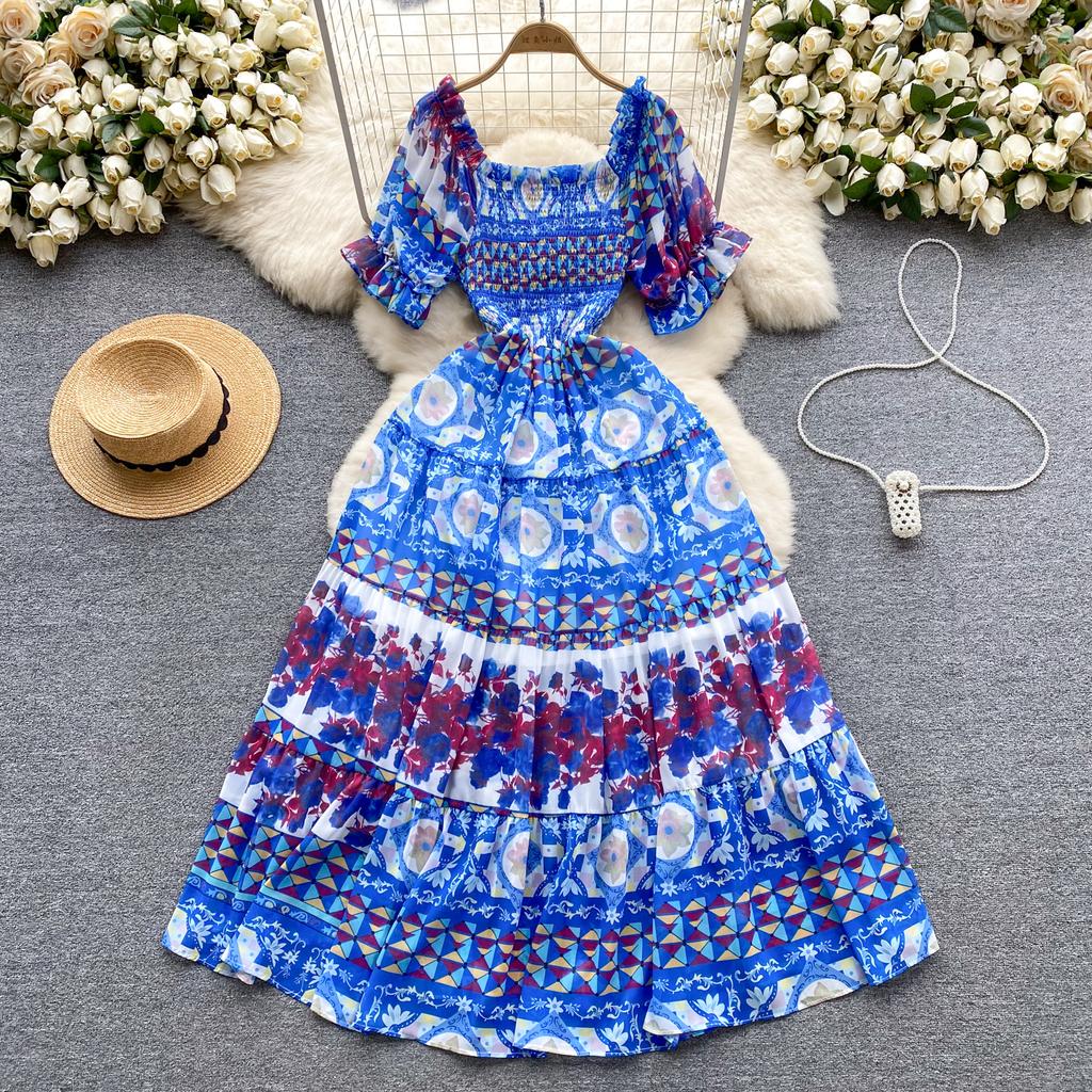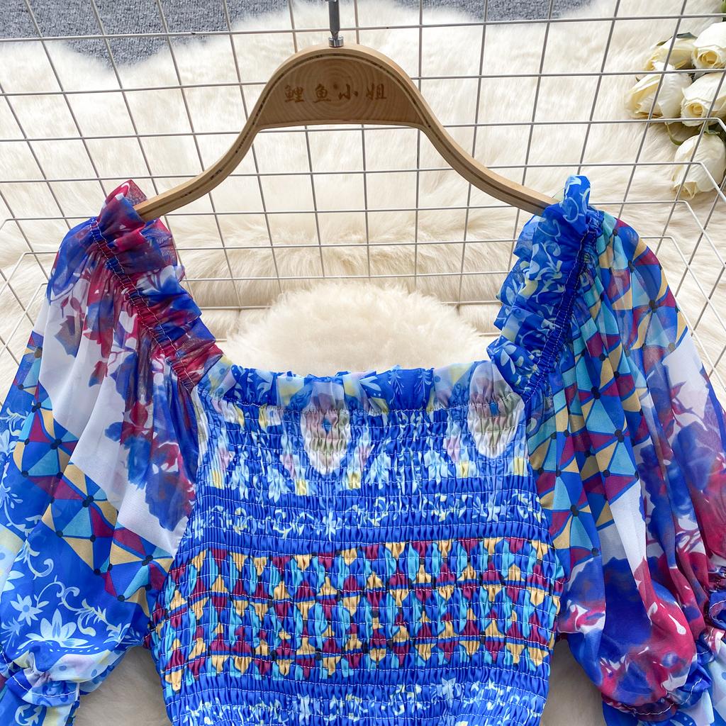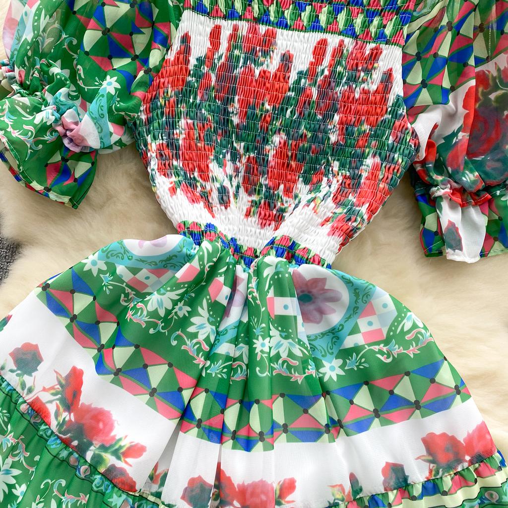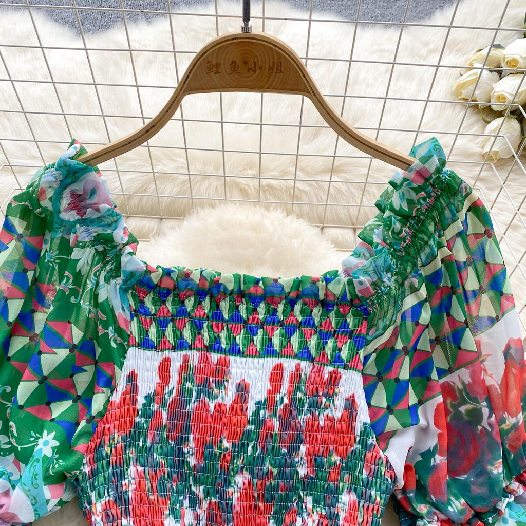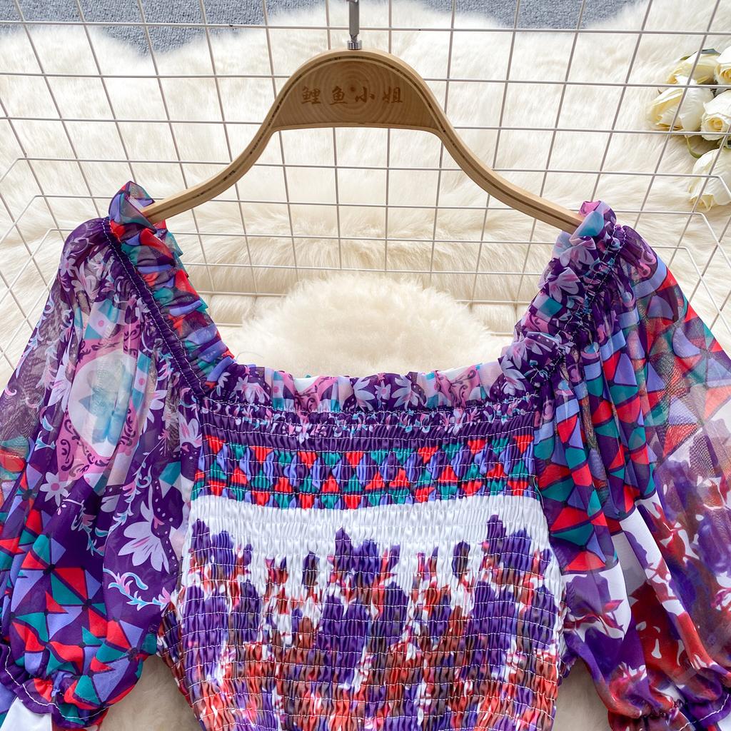 Платье для женщин с квадратным воротником, пышными рукавами и принтом, шифоновые платья трапециевидной формы со складками, эластичные платья Mujer, летняя Прямая поставка