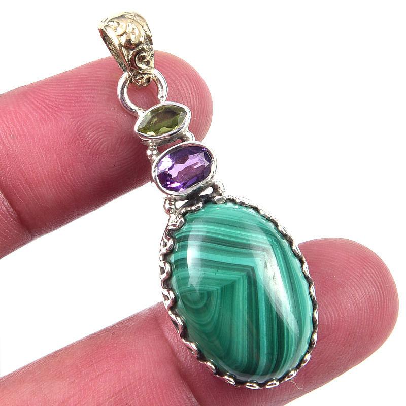 Подвеска из натурального малахита, аметиста, из стерлингового серебра 925 пробы, 1,75 дюйма, w6o59