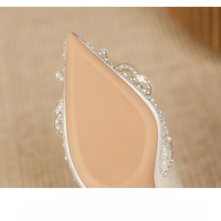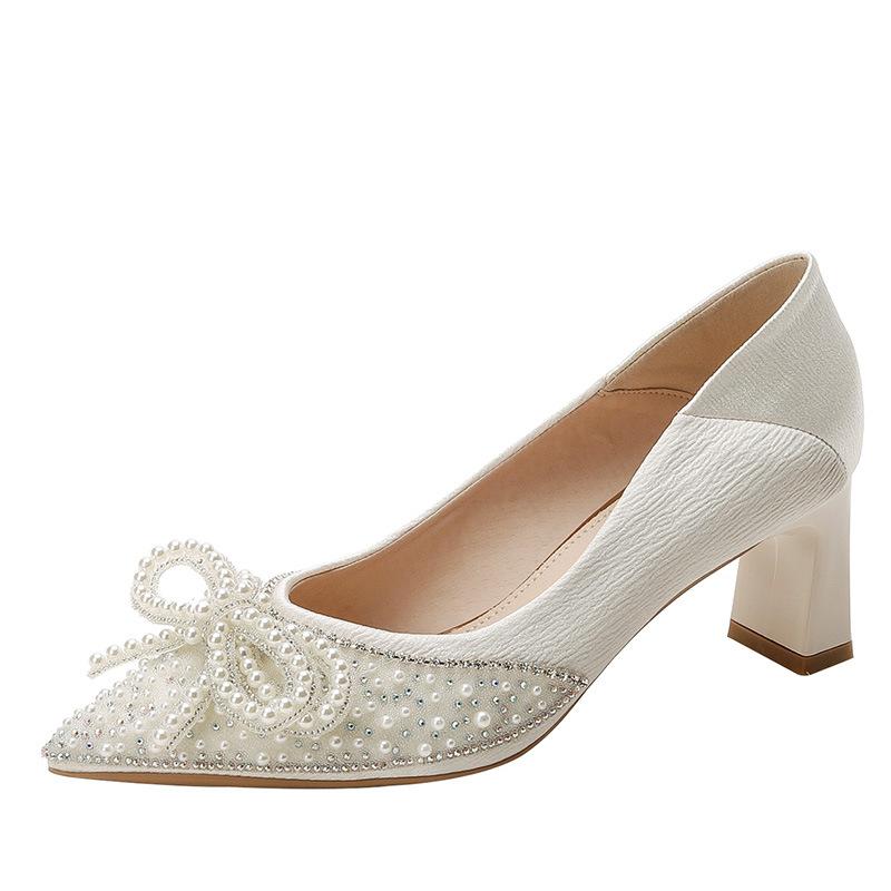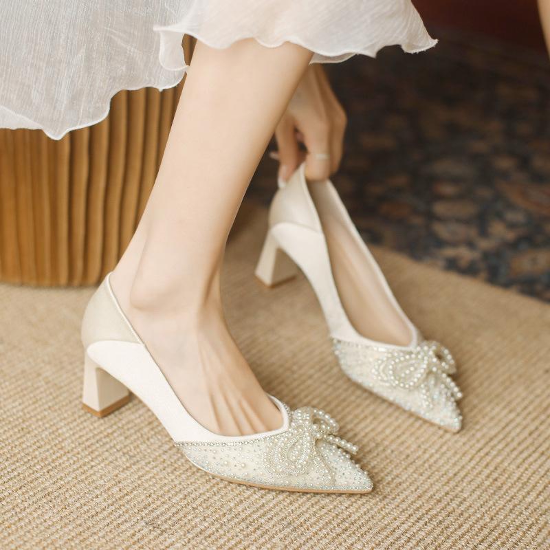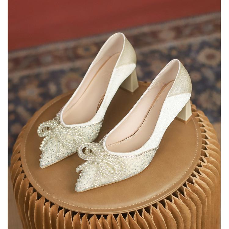Летний новый стиль, высокие каблуки в стиле феи с острым носком, на толстом каблуке с жемчугом
