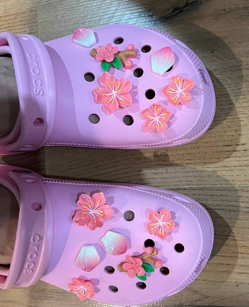Очень красивые. Качественные. Хорошо смотрятся на кроксах, не отваливаются. Краска пока не слезла
