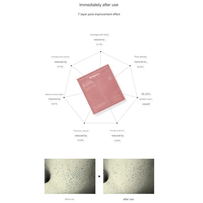 После однократного использования область щек увлажнилась на 126%, а при тестировании на людях было выявлено улучшение объема, площади и глубины пор сразу после использования, улучшение объема пор на 19,40%, площади пор на 19,65%, и количество пор на 16,09%, что свидетельствует о немедленном улучшении эластичности кожи на 34%.