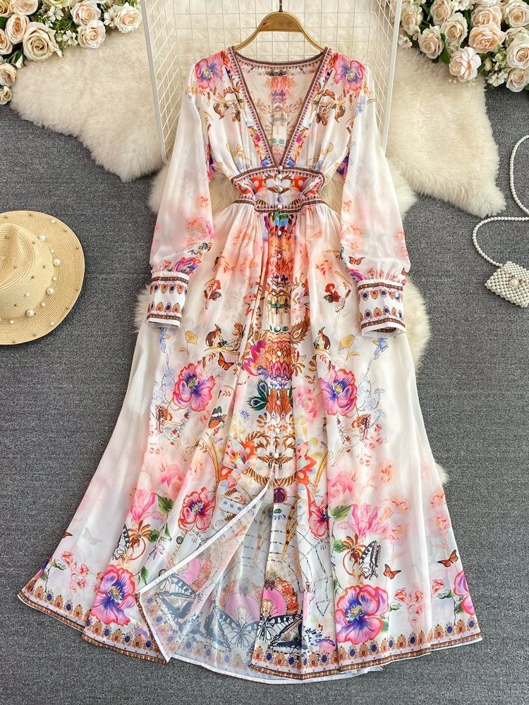 Однобортное свободное платье трапециевидной формы с длинными рукавами и V-образным вырезом на талии и принтом Temperament