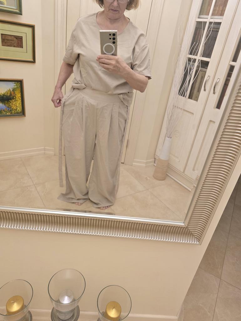 Ткань очень приятная. Цвет тоже. Покупала два разных костюма этой фирмы одного размера. Этот оказался велик. Жалко, надо было на размер меньше покупать, даже, может быть, на два. Больше понравилось как эта модель костюма на мне лежит. Может быть ушью и резинку поменяю на брюках
