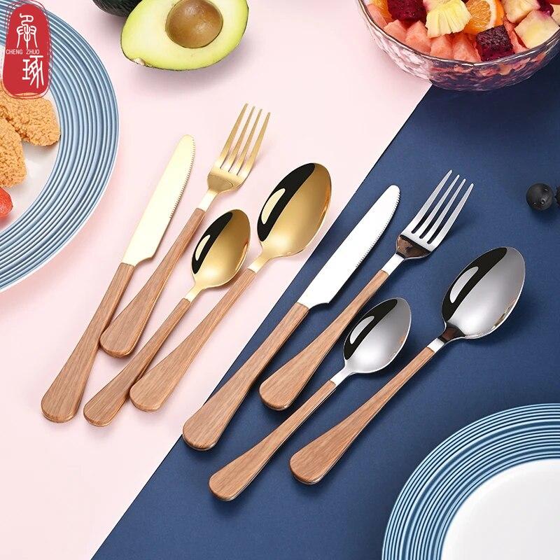 Нож и вилка из 4 предметов, чайная ложка из нержавеющей стали, имитация деревянной ручки, набор посуды в западном стиле, простая и продвинутая