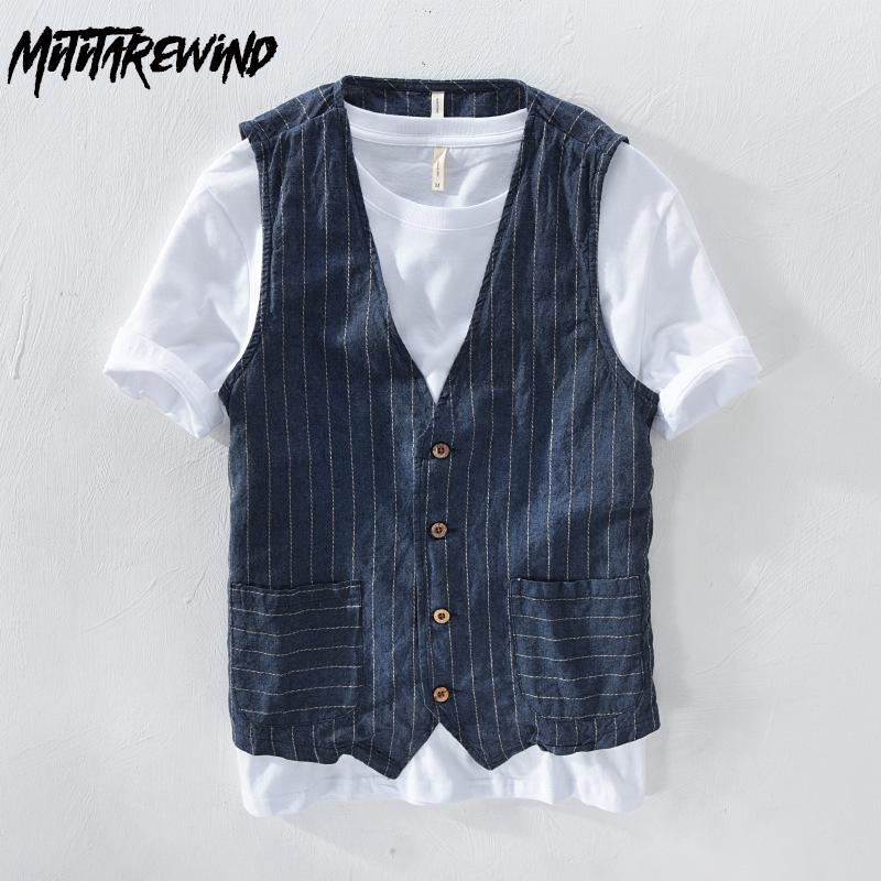 Мужской жилет в английском стиле, летняя модная жилетка, мужская дышащая повседневная куртка с V-образным вырезом, тонкая полосатая безрукавка из хлопка и льна на пуговицах — купить товар онлайн с бесплатной доставкой по всему миру!