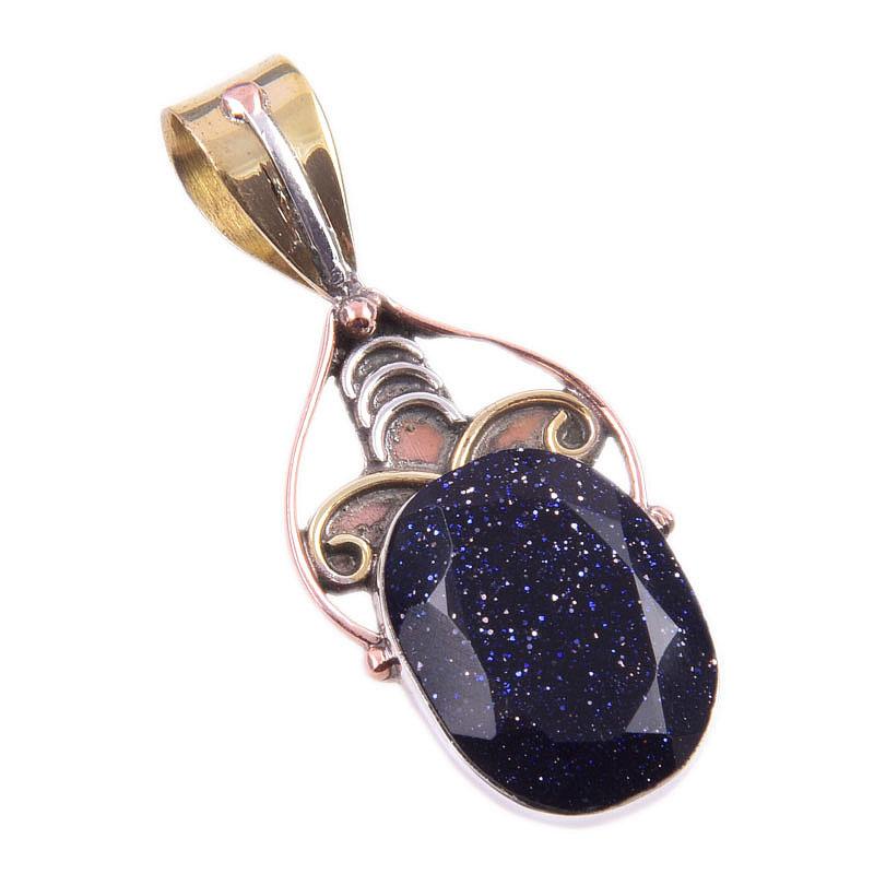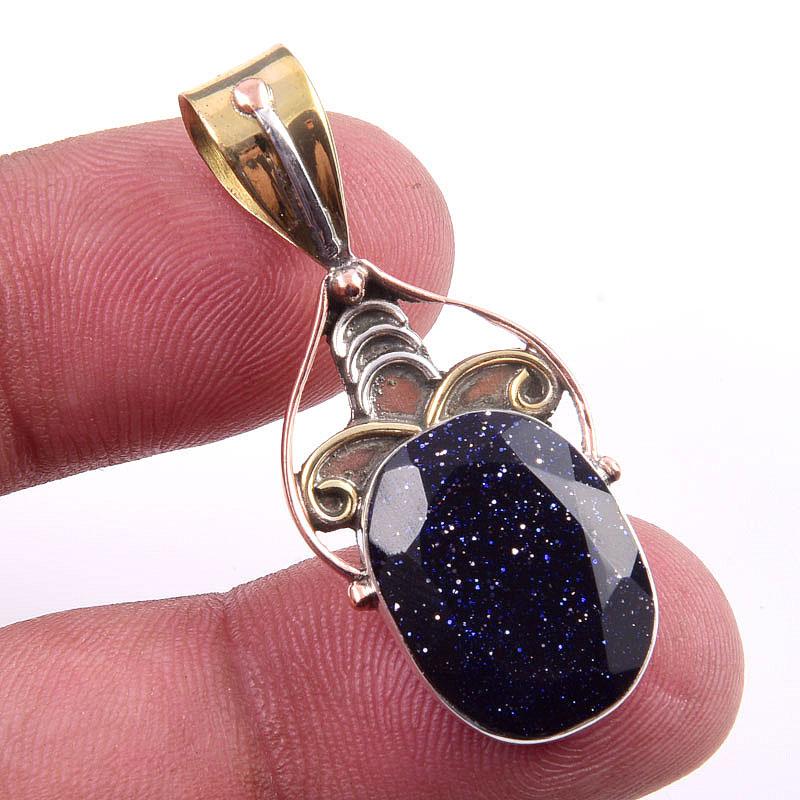 Natural Blue Sunstone 925 Solid Sterling Silver Gift TwoTone Pendant 1.50" A1Q36