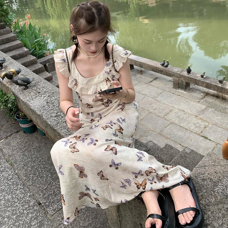 Лето 2025 года, модное повседневное длинное платье с принтом Bufferfly, женское модное шикарное платье с оборками и квадратным воротником, корейское элегантное облегающее платье — купить товар онлайн с бесплатной доставкой по всему миру!