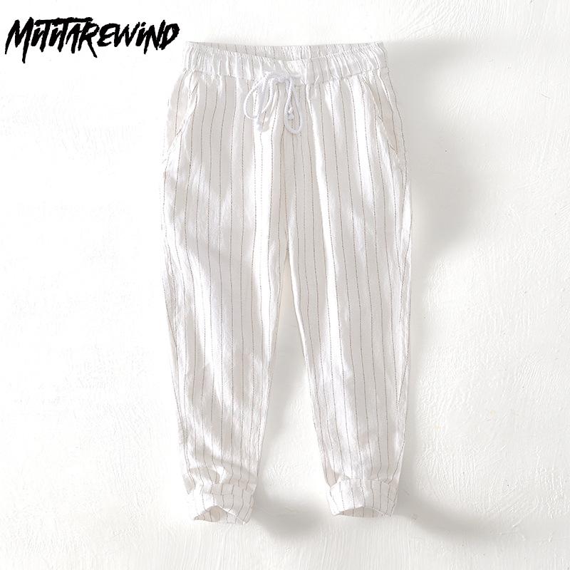 Летние хлопковые льняные мужские брюки, узкие брюки с эластичной талией и завязками на шнурке, повседневные дышащие модные полосатые мужские брюки — купить товар онлайн с бесплатной доставкой по всему миру!